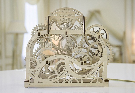 Театр, как и все модели UGEARS, отличается полностью открытой конструкцией и до мелочей продуманными деталями. За сценой, созданной из плавных деревянных переплетений, заметны различного размера шестеренки, которые и приводят весь механизм в действие. Модель не только развивает воображение, но и позволяет заглянуть в закулисье и узнать все принципы работы уникальной механической скульптуры.