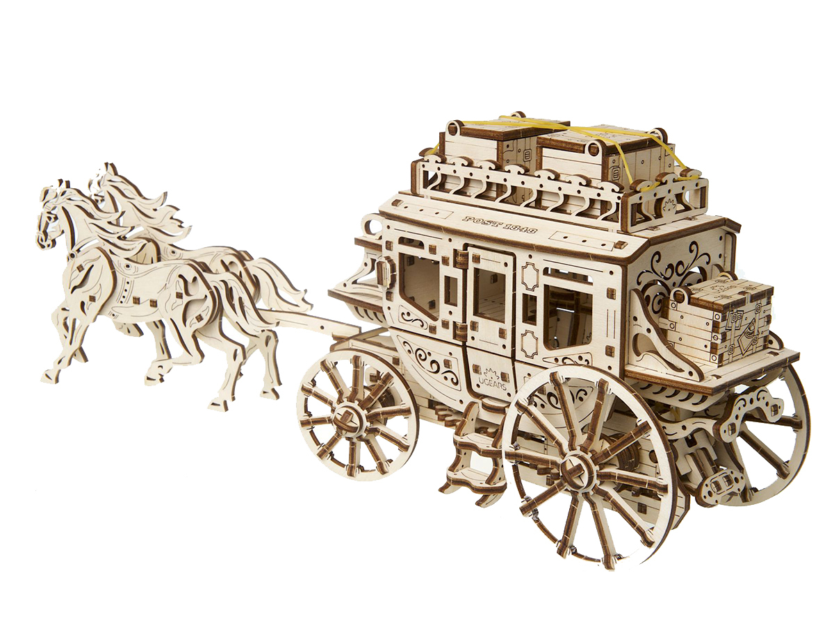 3D-пазл UGears Stagecoach представляет собой настоящий почтовый дилижанс XIX века. Тогда дилижанс поставлял письма, посылки и деньги, а теперь его уменьшенную копию можно воссоздать в кругу семьи. При этом из пазла собирается не только дилижанс и кони, но и встроенный механизм, который позволит по-настоящему отправлять послания домочадцам.