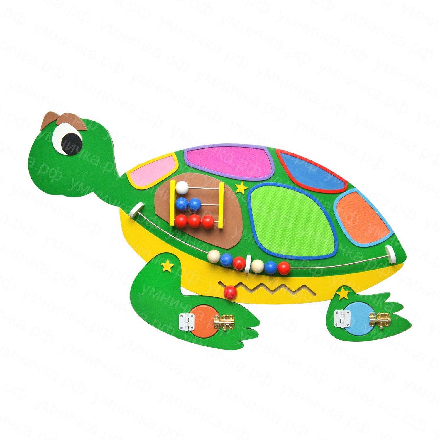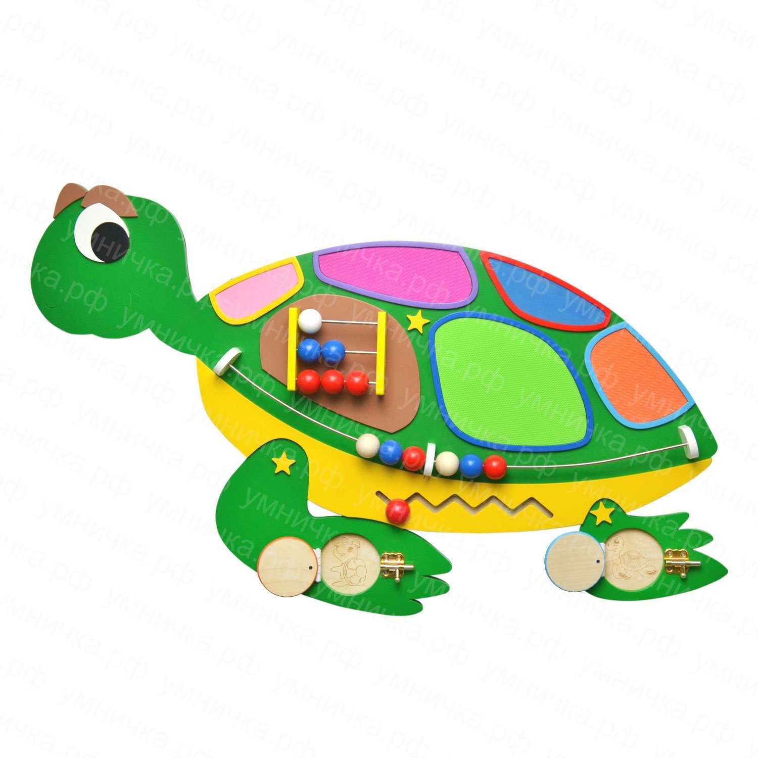 Настенная тактильно-развивающая панель «Черепаха» разработана компанией «Умничка™» для детей младшего и среднего дошкольного возраста (3-5 лет). Игры с этим бизибордом развивают логику, моторику рук, воображение, устную речь, внимание и другие способности и навыки детей. Оборудование идеально подходит для оснащения игрового пространства: