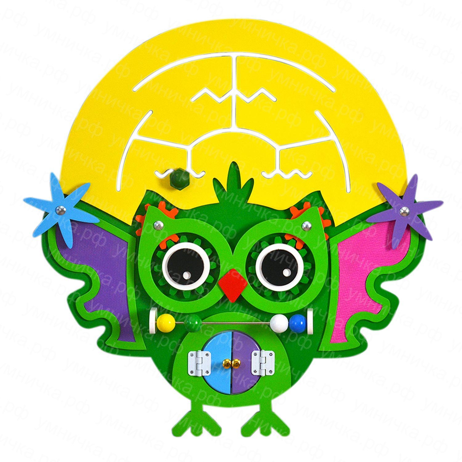 Все виды сов, кроме белой, охотятся ночью и спят днем. Поэтому бизиборд «Сова» выполнен в виде летящей птицы на фоне сияющей Луны. Основные цвета панели — желтый и зеленый — благотворно действуют на психику и эмоциональное состояние дошкольников во время игры. Способствуют спокойному и позитивному настроению.