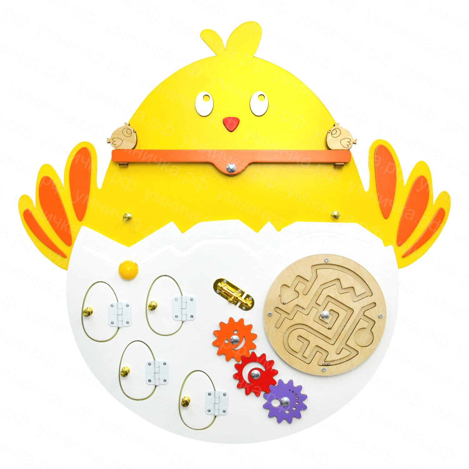 Настенный бизиборд «Цыпленок» — птенец, который только-только появился на свет, однако эта малютка уже умеет увлекать и развивать. Тактильно-развивающая панель предназначена для работы с детьми 3-7 лет: