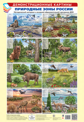 Комплект «Природные зоны России» состоит из 8 цветных демонстрационных картин формата А3 и этикетки, на обороте которой приводятся беседы, игры, занятия и упражнения с детьми по каждой картине.