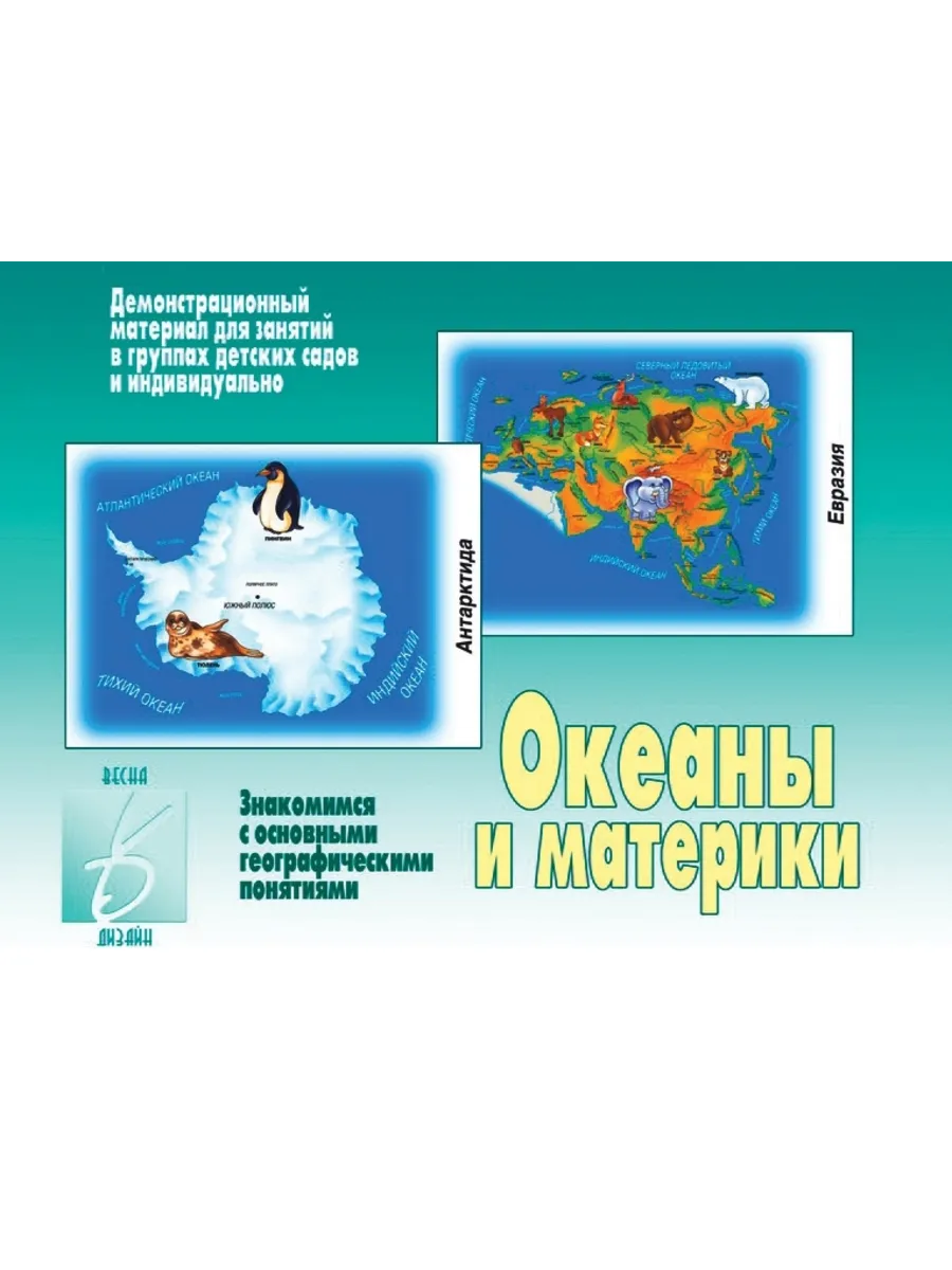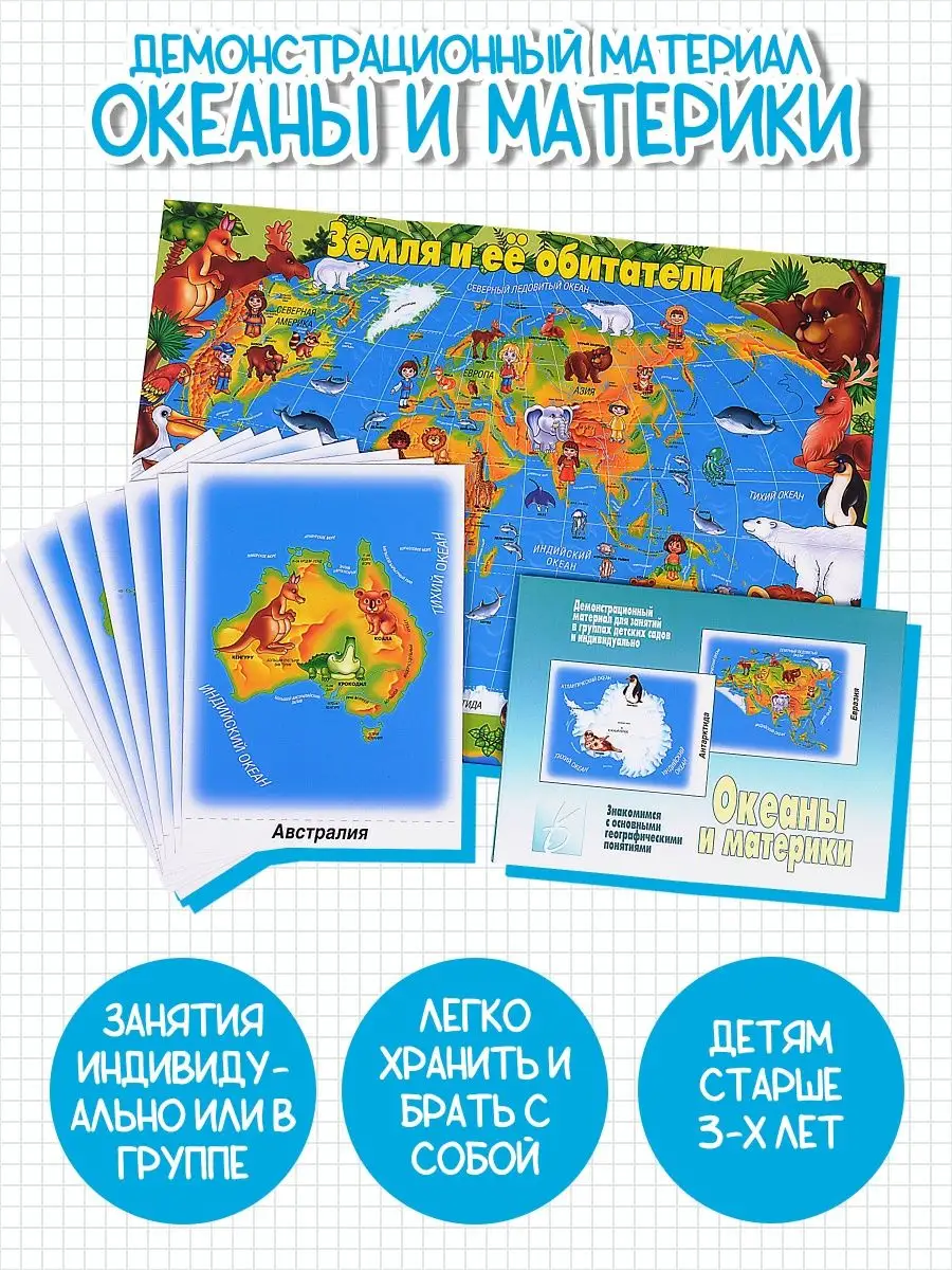 Данный демонстрационный материал знакомит детей с географией. Изображения материков и карты мира подходят для занятий в группах детского сада, а также индивидуально. Картинки дают яркое представление о материках и океанах, об их форме и месторасположении, а также о проживающих там народах и животных.