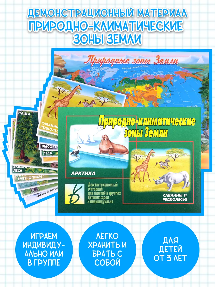 Предлагаем демонстрационный дидактический материал в веде развивающих карточек, знакомящий детей с природно-климатическими зонами на нашей планете. На картинках изображены обитатели этих зон и среда обитания, климат, в котором они проживают. Познавательная игра подходит для занятий в группах детского сада, а также индивидуально.