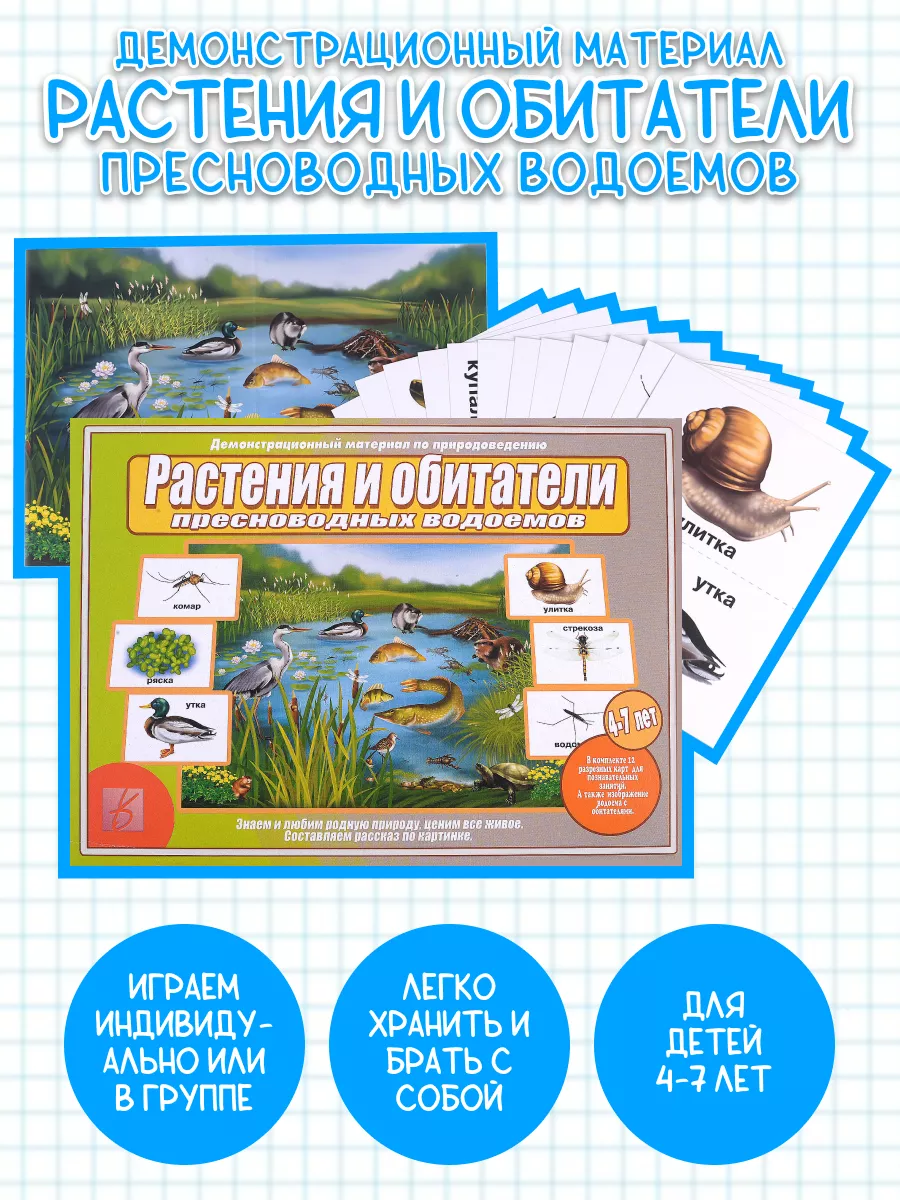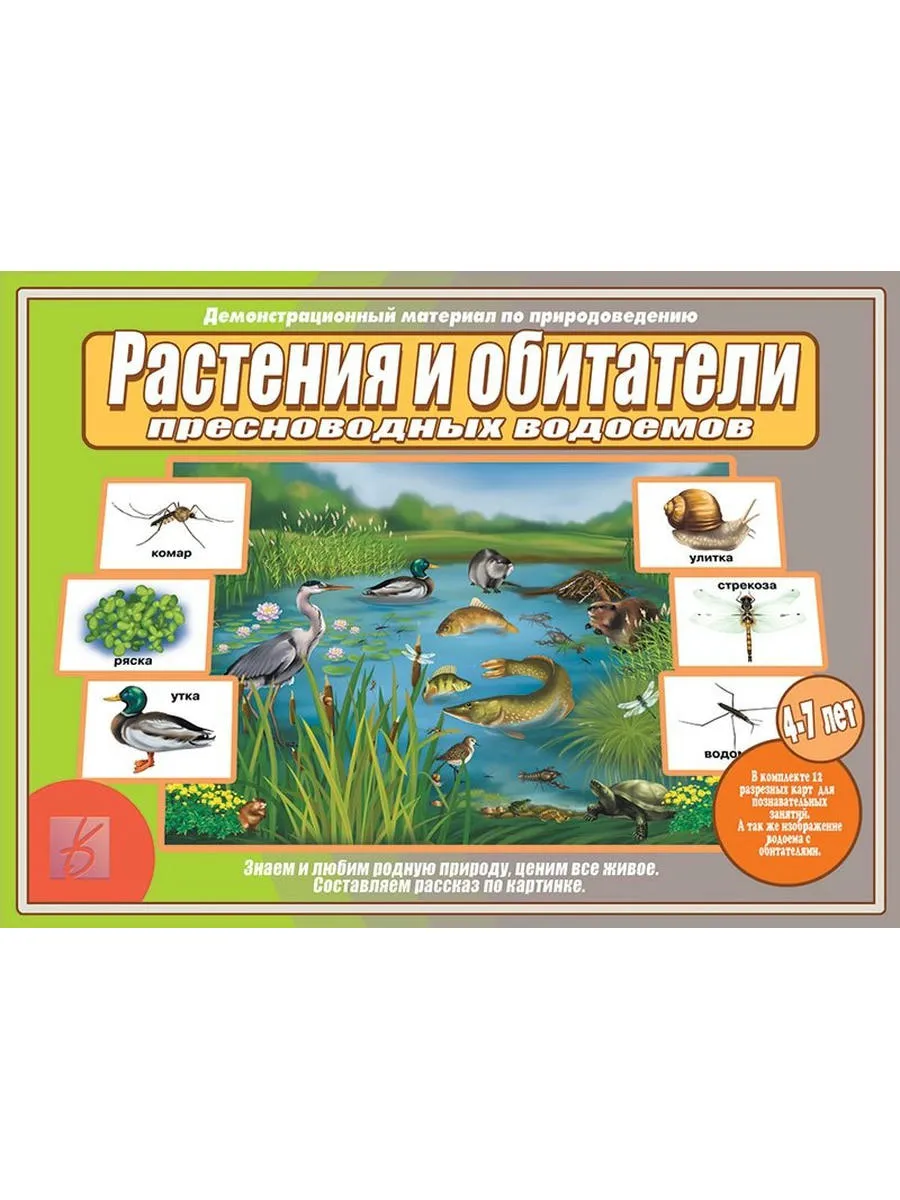 Материал пособия поможет объяснить и показать детям как живет пресноводный водоем средней полосы. Знакомство с его обитателями и растениями - прекрасная возможность объяснить малышам насколько хрупко и ценно все живое, как важны экологические знания. Тысячи маленьких прудов и озер - это и есть живая и чистая природа нашей страны. Рак и водомерка, утка и ряска, кулик и бобер, все это на картинках, предлагаемых для занятий. Данный материал поможет расширить кругозор детей, разовьет в них тягу к знаниям.