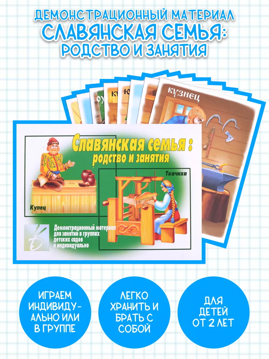 Предлагаем демонстрационный материал, который познакомит детей с историей Древней Руси, образом жизни славян, их бытом и семейным укладом, ремёслами. Дети узнают всё о родственных связях: кто, кому и кем приходится в семье.
