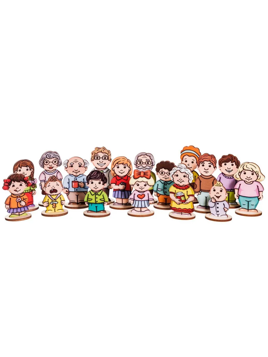 Дидактический материал Smile Decor "Дружная семья", деревянные фигурки для сюжетно-ролевых игр, 18 деталей с подставками.