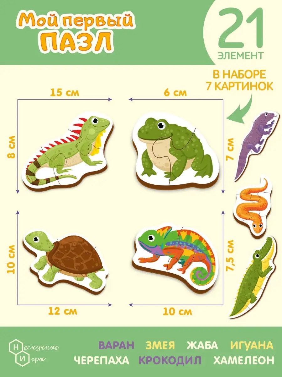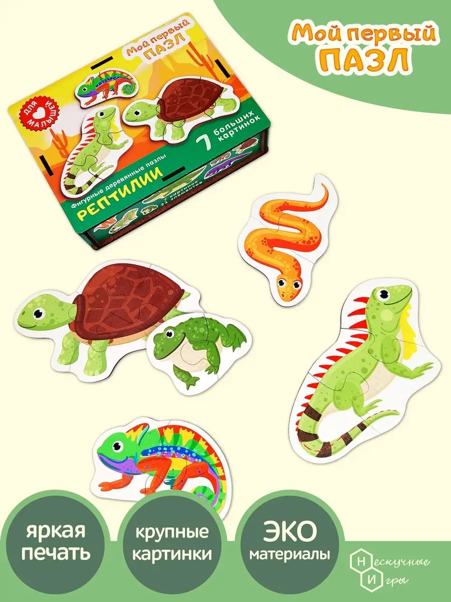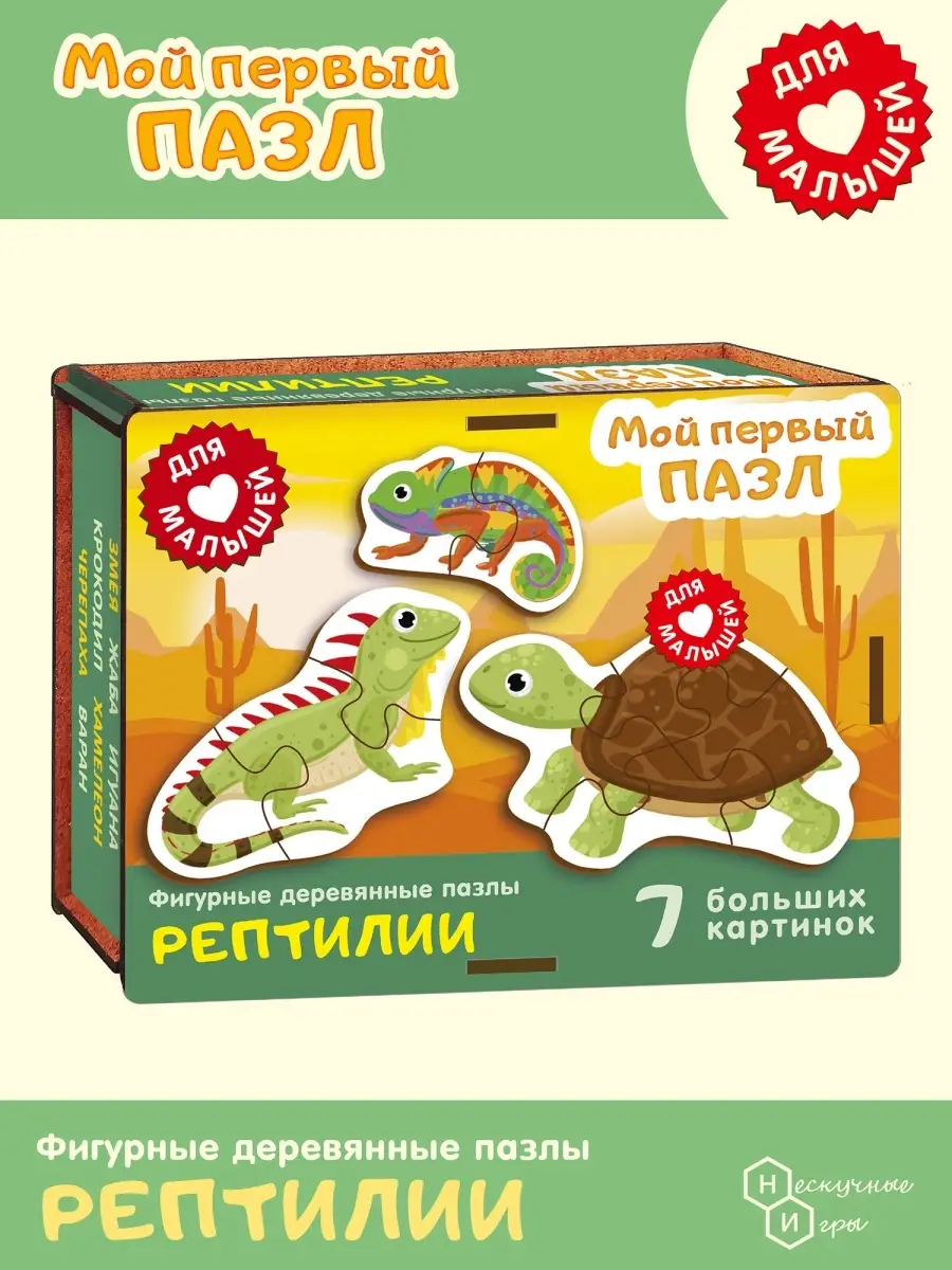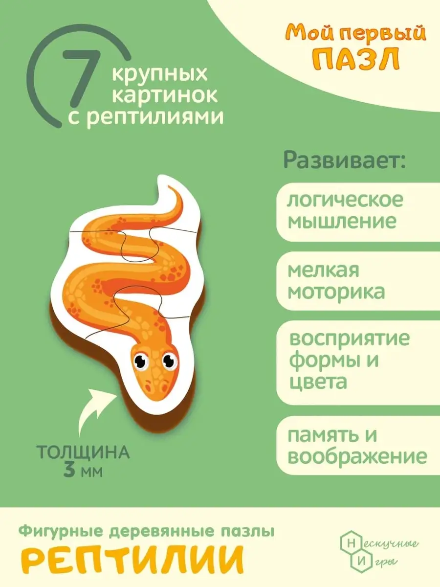 Представляем вам увлекательный фигурный деревянный пазл Рептилии от бренда Нескучные игры! Этот замечательный пазл станет настоящим открытием для юных исследователей, которые только начинают познавать мир.
