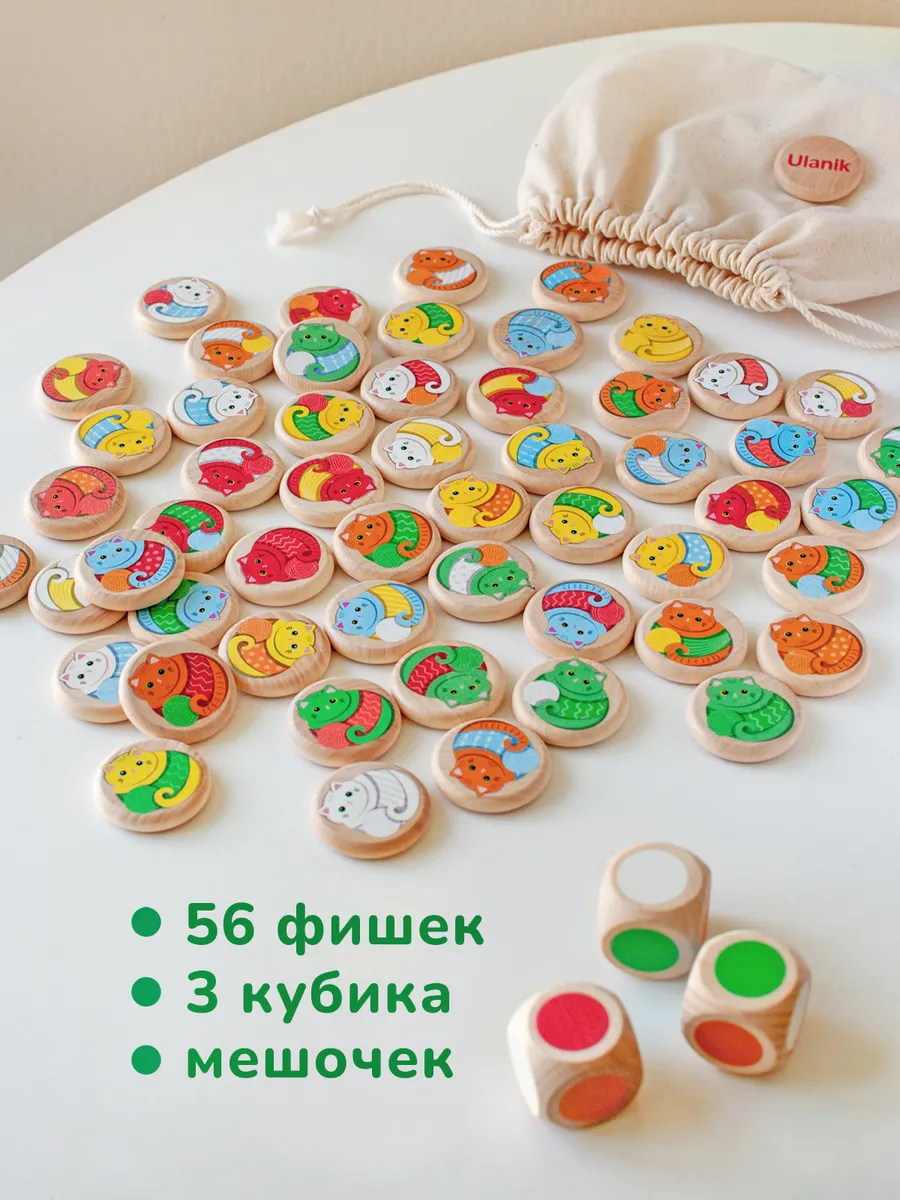 Состав набора: 56 фишек диаметром 4х4 см, 3 кубика и мешочек.