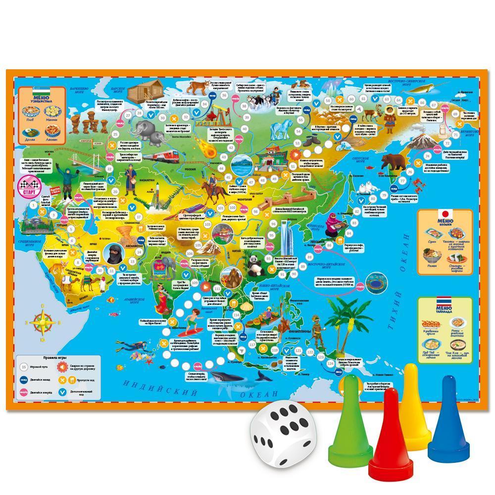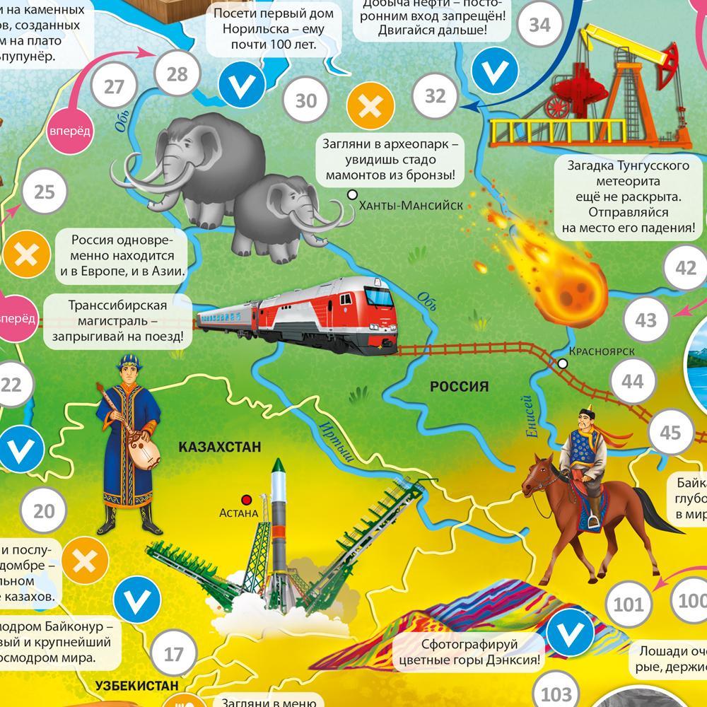 По пути к финишу вас ждёт множество интересных фактов о странах, располагающихся на этом материке, названия национальных блюд и достопримечательностей, красочные иллюстрации и, конечно же, захватывающие задания.