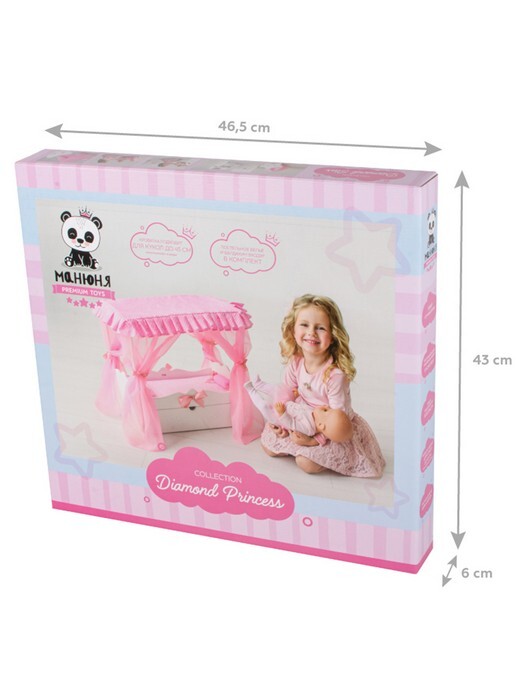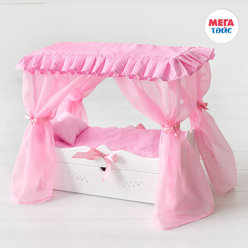 Кроватка для куклы из коллекции Diamond Princess с выдвижным ящиком для удобства хранения аксессуаров выполнена в бело-розовой цветовой гамме и украшена сияющими стразами и нарядными атласными лентами.