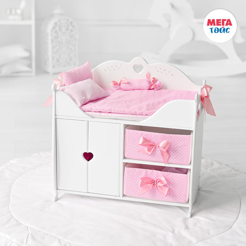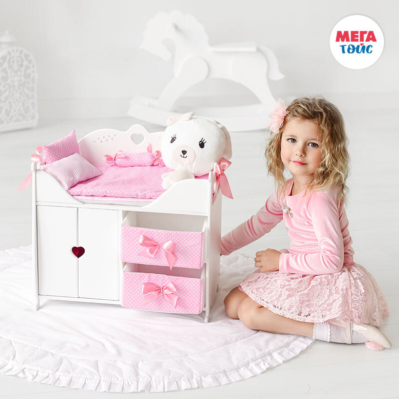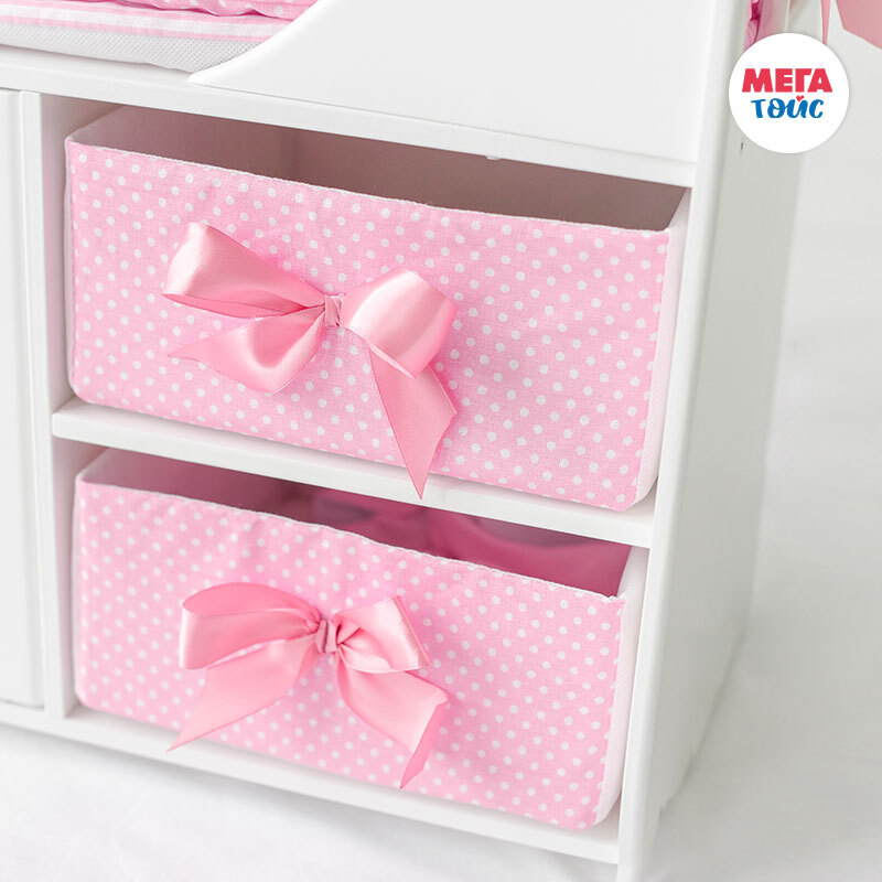 Игрушка из серии Diamond Princess представляет собой многофункциональный игровой комплекс. Пеленальный столик оборудован мягким матрасиком, большой подушкой и декоративной подушкой-валиком с нарядными атласными бантами. Комплекс имеет прямоугольную форму и прочный деревянный корпус, окрашенный гипоаллергенными итальянскими красками. Его верхняя часть представляет собой зону для пеленания и сна, а внизу оборудовано 3 места для хранения вещей: шкаф со штангой под вешалки и две мягкие выдвижные корзины с бантиками. Корпус игрового комплекса украшен сияющими стразами.
