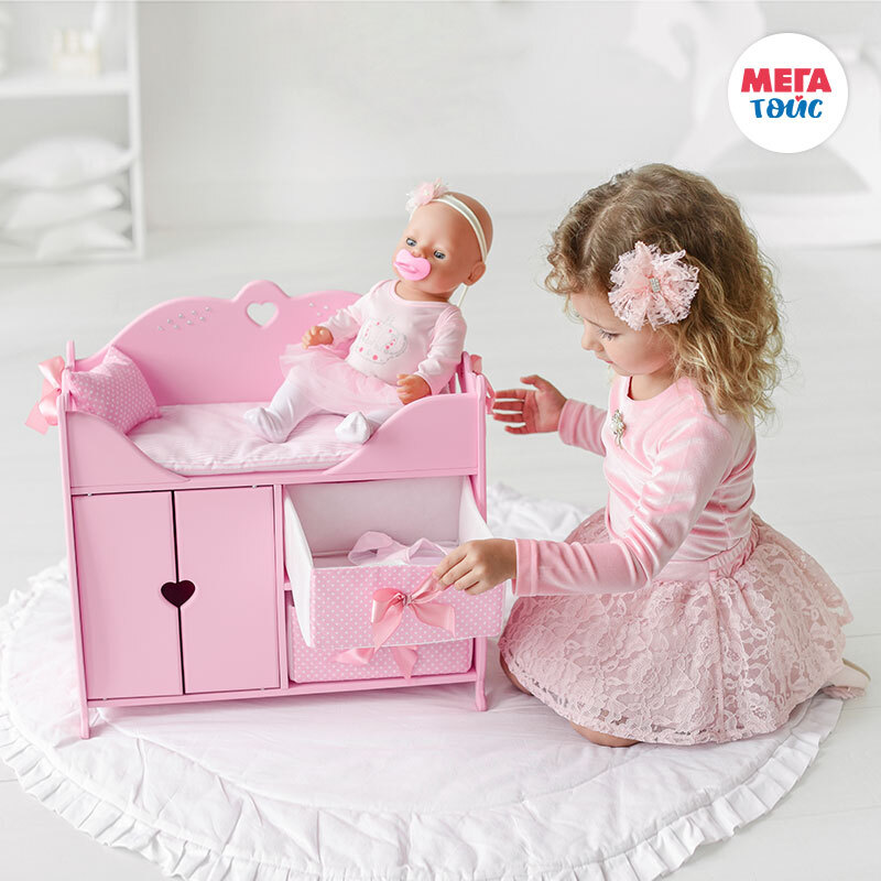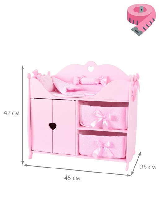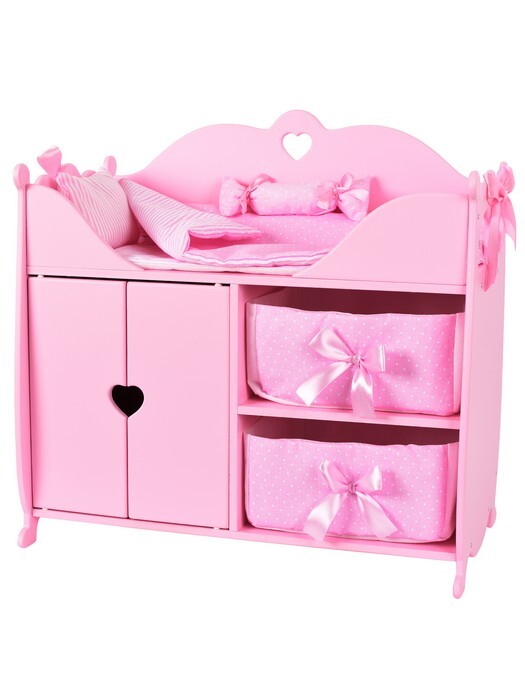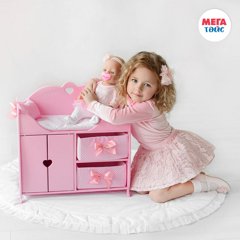 Игрушка из серии Diamond Princess представляет собой многофункциональный игровой комплекс. Пеленальный столик оборудован мягким матрасиком, большой подушкой и декоративной подушкой-валиком с нарядными атласными бантами. Комплекс имеет прямоугольную форму и прочный деревянный корпус, окрашенный гипоаллергенными итальянскими красками. Его верхняя часть представляет собой зону для пеленания и сна, а внизу оборудовано 3 места для хранения вещей: шкаф со штангой под вешалки и две мягкие выдвижные корзины с бантиками. Корпус игрового комплекса украшен сияющими стразами.