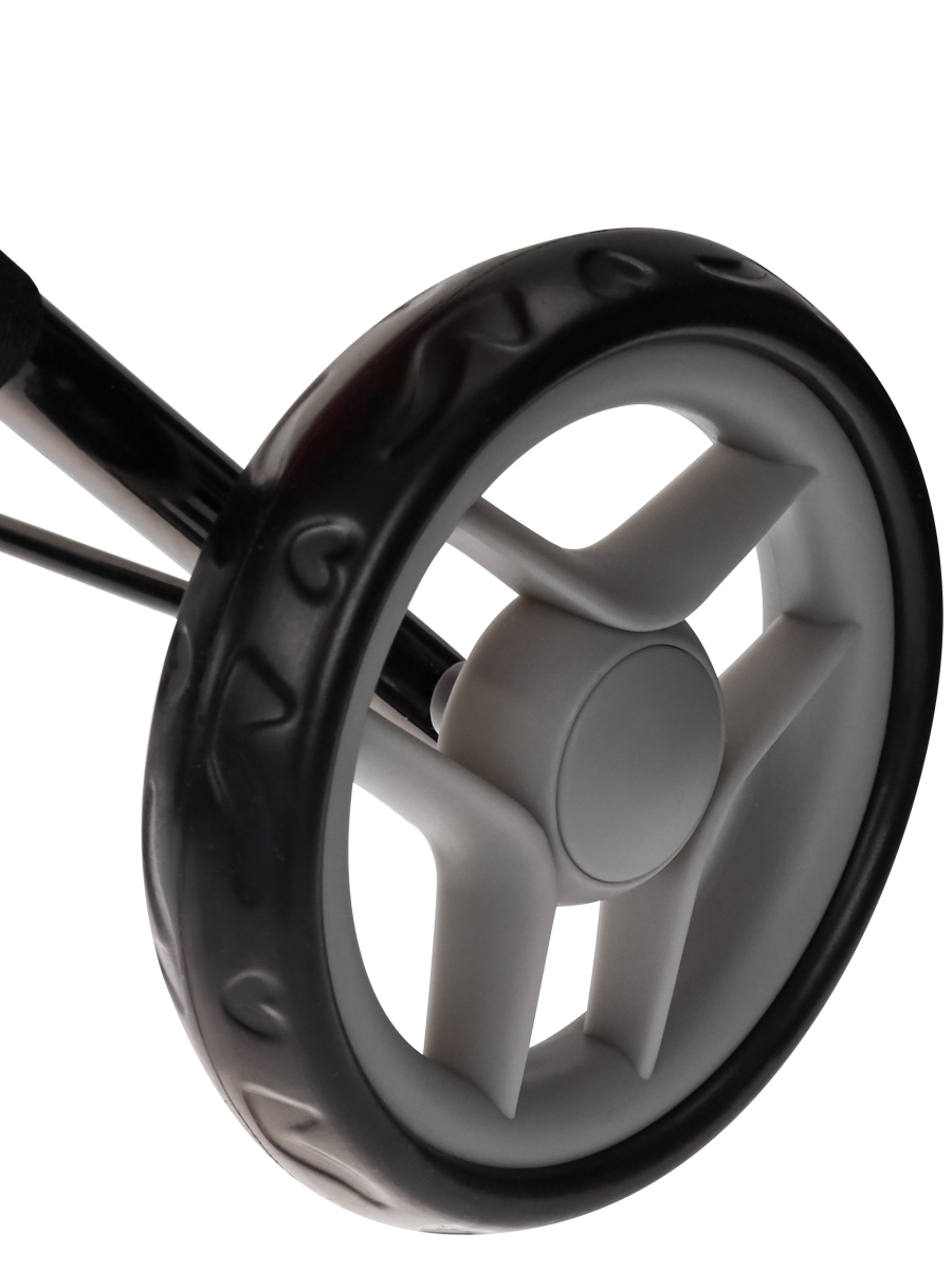 Колёса 10х15 см и задние колёса 5х18 см, регулируемая ручка, размер ручки 45~72,5 см, складной козырёк, сетчатая корзина.