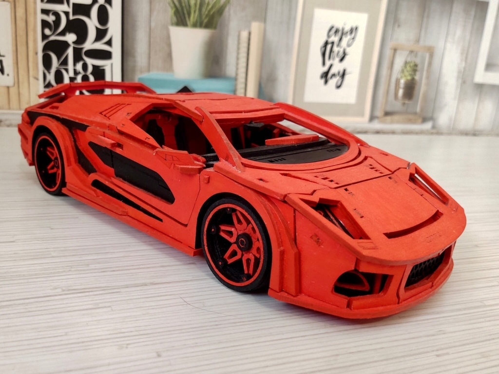 У собранной модели вращаются колеса, открываются двери, крышка отсека двигателя и багажник. Дерзкий характер спорткара подчеркивают плоский силуэт с низкой посадкой, массивная решетка радиатора, кузов с вертикальным открытием дверей, а так же эффектные, углубленные фары! При желании игрушку можно раскрасить акриловыми красками.