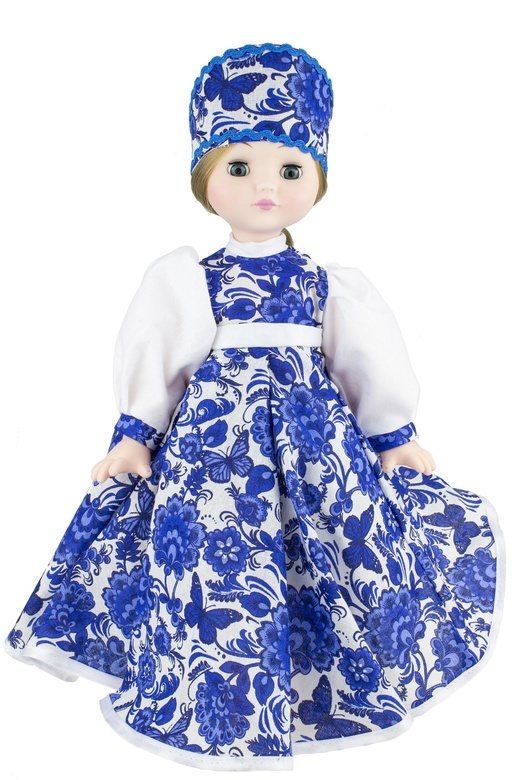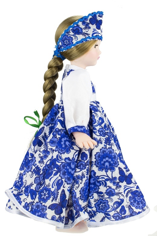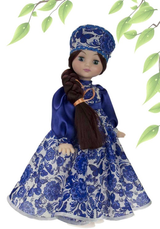 Кукла Василина гжель из коллекции «Русские красавицы» классическая кукла: тело, ноги из пластика, голова, руки из мягкого пластизоля, глазки-моргалки, волосы длинные прошитые. Прекрасные волосы убраны в шикарную косу. Кокошник и платье с принтом в стиле хохломских узоров.