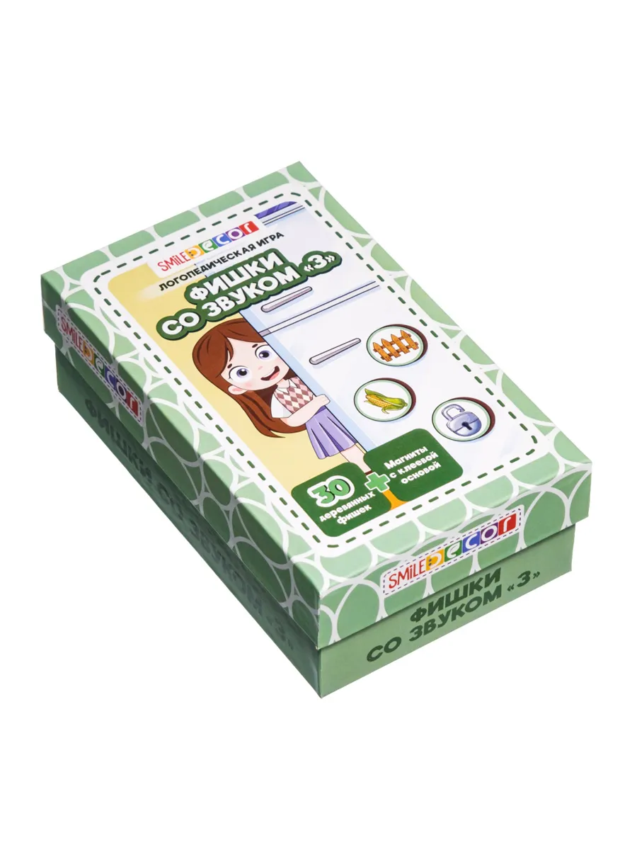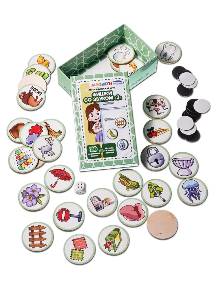 Логопедическая игра "Фишки со звуком З", магнитная игра с кубиком, игровое пособие для развития и постановки речи, автоматизация звука "З", 30 деревянных фишек и 30 магнитов с клеевой основой.