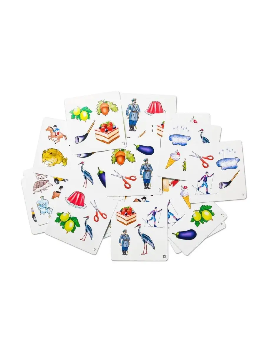 2. Игра "Лого-Доббль". Поместите стопку карточек рубашкой вверх на столе перед игроками. Переверните две верхние карточки и предложите найти изображение, которое присутствует на обеих карточках. Первый, кто найдет верное совпадение, громко его называет, забирает обе карточки себе и затем вытягивает две новые карточки, которые кладет на стол рубашкой вниз. Победитель определяется по наибольшему количеству собранных карточек.