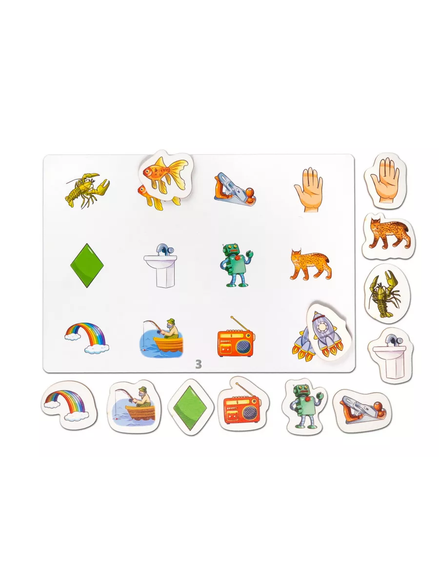 4. Игра "Назови правильно". Рассмотрите вместе с ребенком все карточки и предложите выбрать одну из них. Фигурки разложите на столе. Предложите ребенку правильно назвать все картинки на карточке и закрыть их соответствующими фигурками.