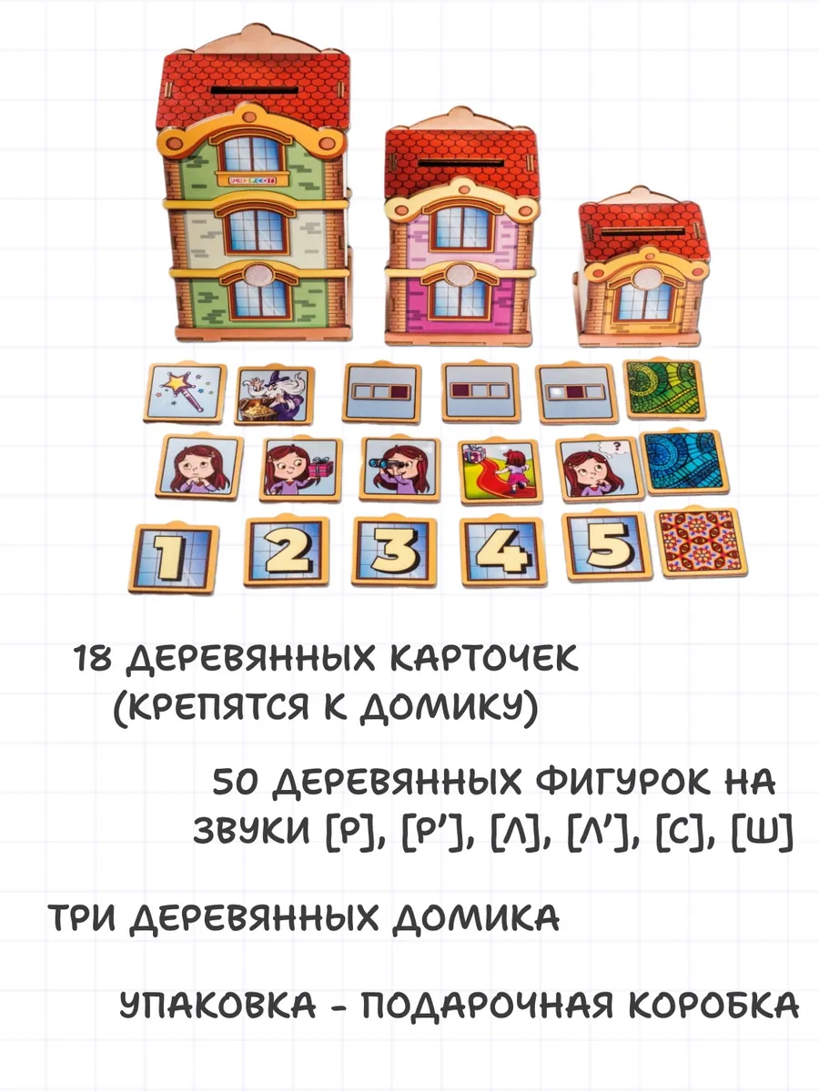 Настольная игра представлена в виде сортера с домиками. Дидактическая игра поможет расширить словарный запас ребенка. Логопедические игры на звуки помогут запустить речь у неговорящих детей и отработать постановку звуков для детей с фонематическими нарушениями.