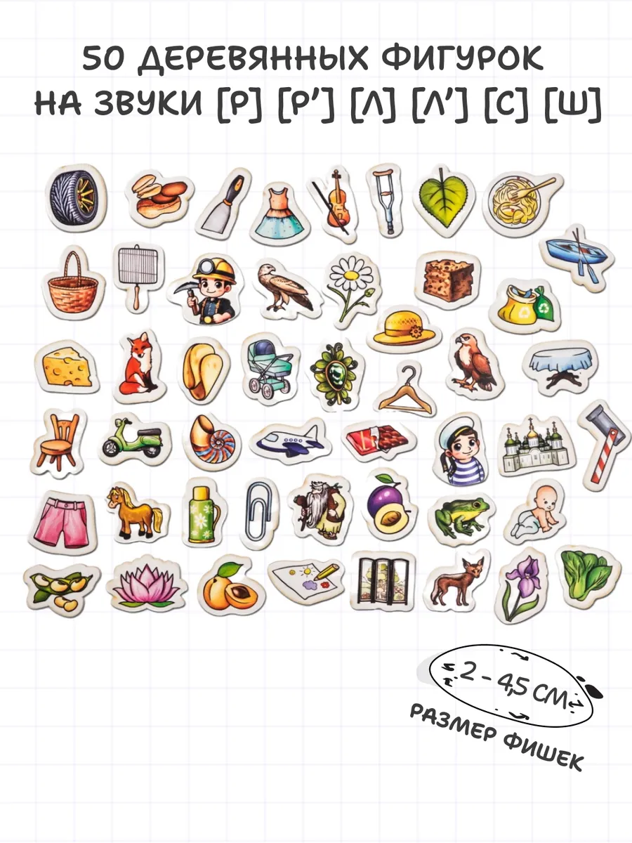• 50 деревянных фигурок, в названии которых встречаются звуки [р], [р’], [л], [л’], [с], [ш];(размер 2 см - 4,5 см).