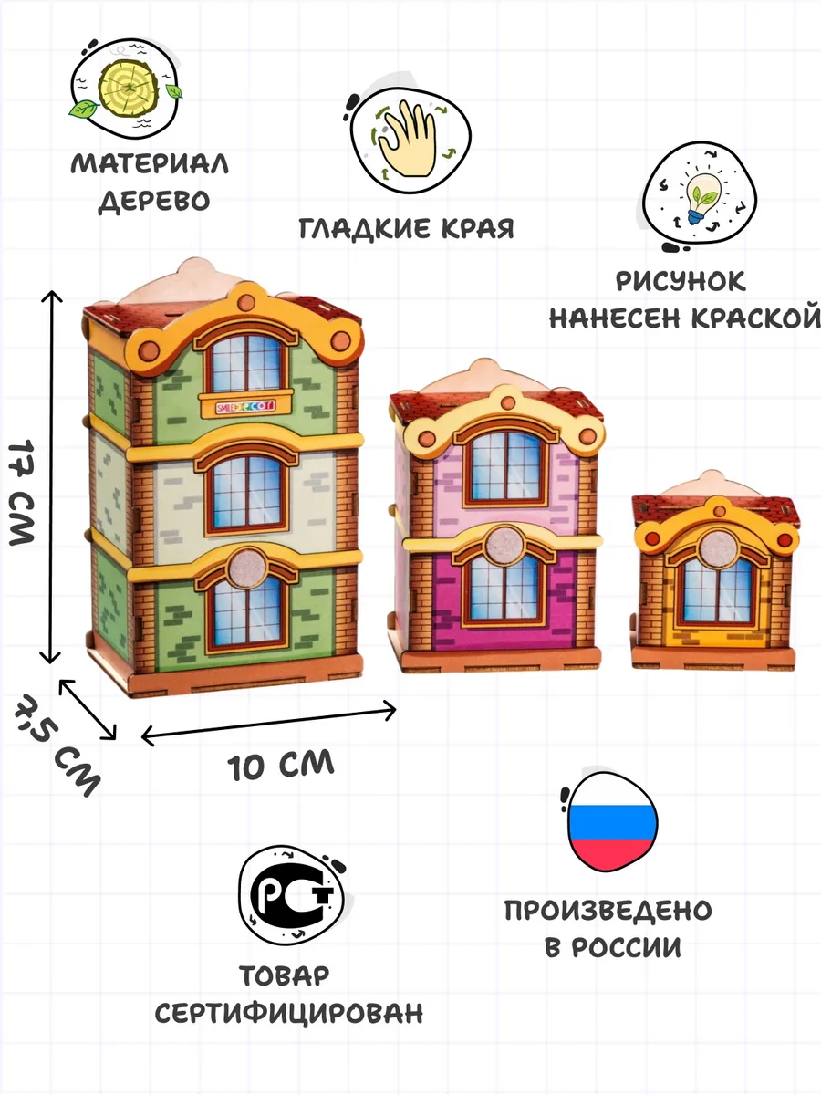• три домика: одноэтажный, двухэтажный, трехэтажный с липучкой для прикрепления деревянной карточки;