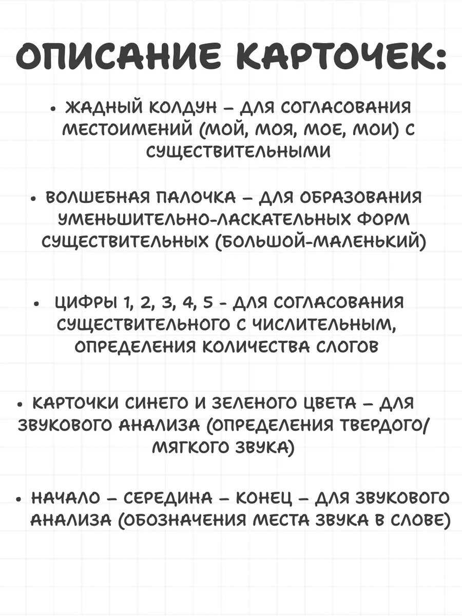Логопедическое пособие от российского бренда Smile Decor (Смайл Декор) для педагогов, логопедов, дефектологов, воспитателей детского сада и родителей детей предназначено для формирования грамматического строя речи, автоматизации и дифференциации звуков, развития фонематического анализа, умения определять количество слогов в слове, развития связной речи.