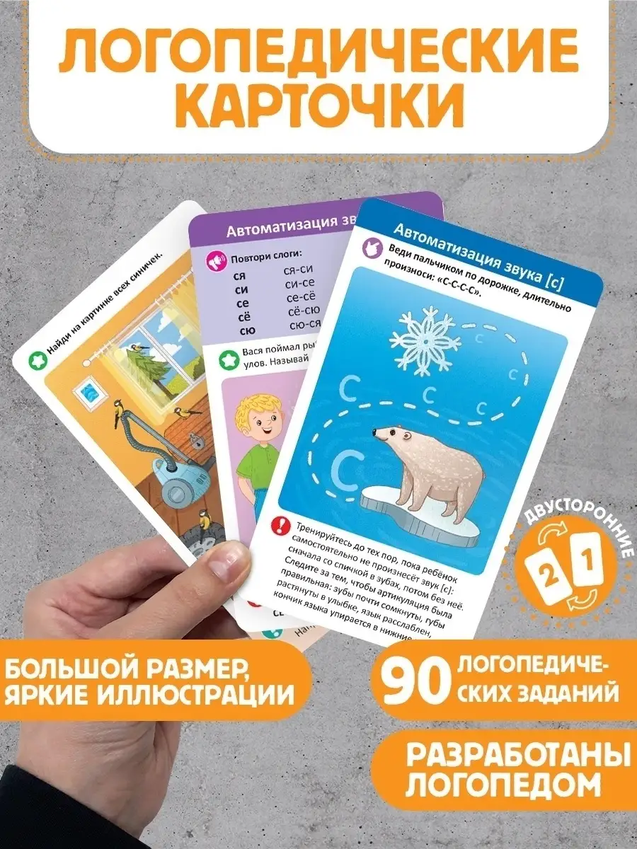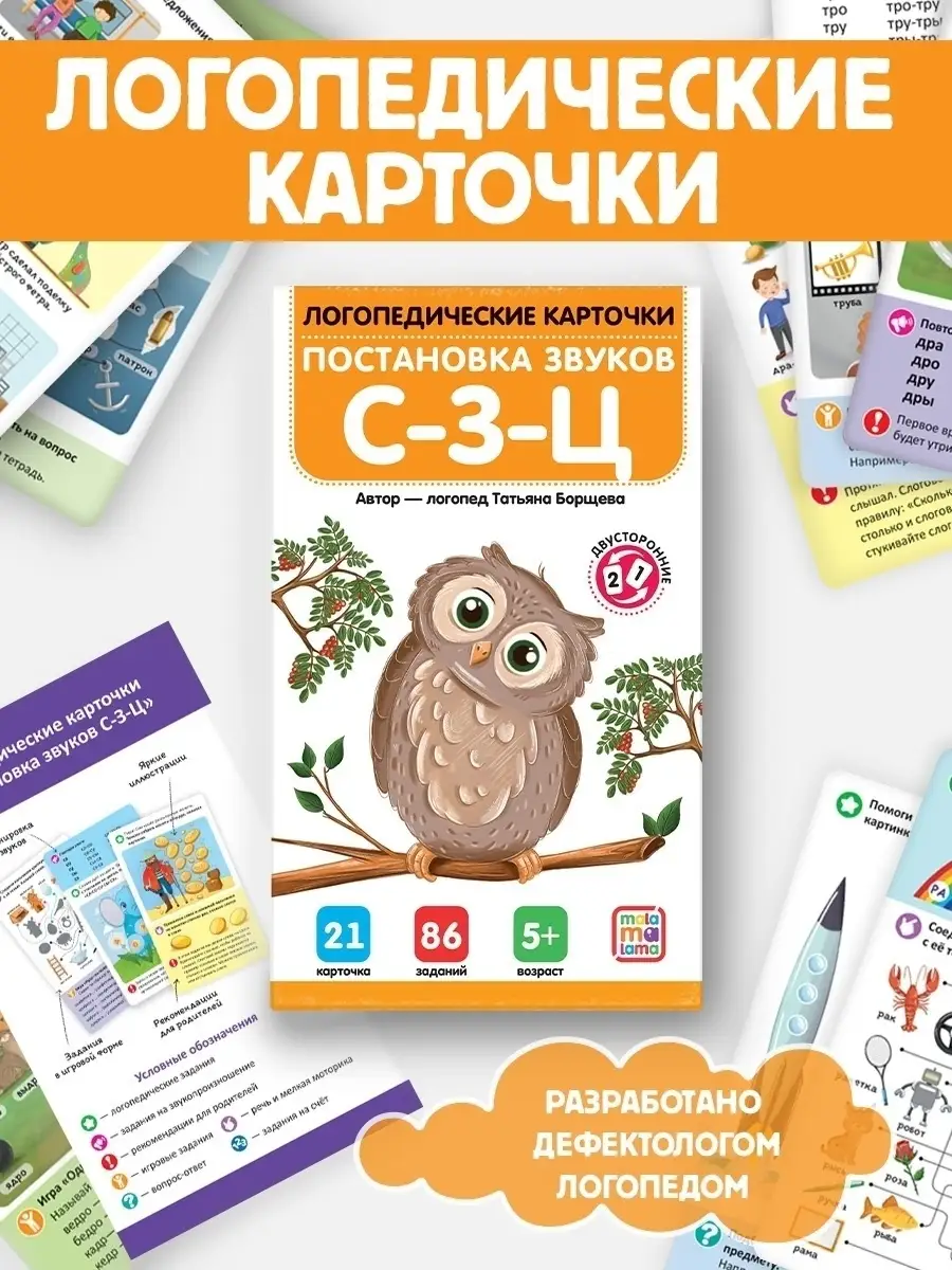 Набор иллюстрированных логопедических карточек «Постановка и автоматизация звуков С-С’-З-З’-Ц» от торговой марки Malamalama — отличный тренажёр для развития речи детей. На карточках вы найдёте упражнения и игры, которые помогут отработать и автоматизировать произношение свистящих звуков (С, С’, З, З’, Ц) в слогах, словах и предложениях. Все задания составлены практикующим логопедом Татьяной Борщевой.