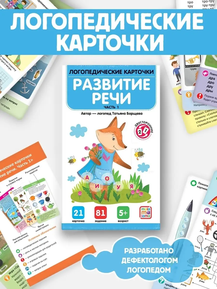 "Набор иллюстрированных логопедических карточек «Развитие речи. Часть 1» от торговой марки Malamalama — отличный тренажёр для развития речи детей. На карточках вы найдёте упражнения и игры, которые помогут ребёнку расширить словарный запас и правильно применять слова в речи. В заданиях представлены слова из следующих лексических тем: «Осень», «Зима», «Весна», «Лето», «Овощи», «Фрукты», «Ягоды», «Грибы», «Игрушки», «Посуда». Все упражнения составлены практикующим логопедом Татьяной Борщевой.