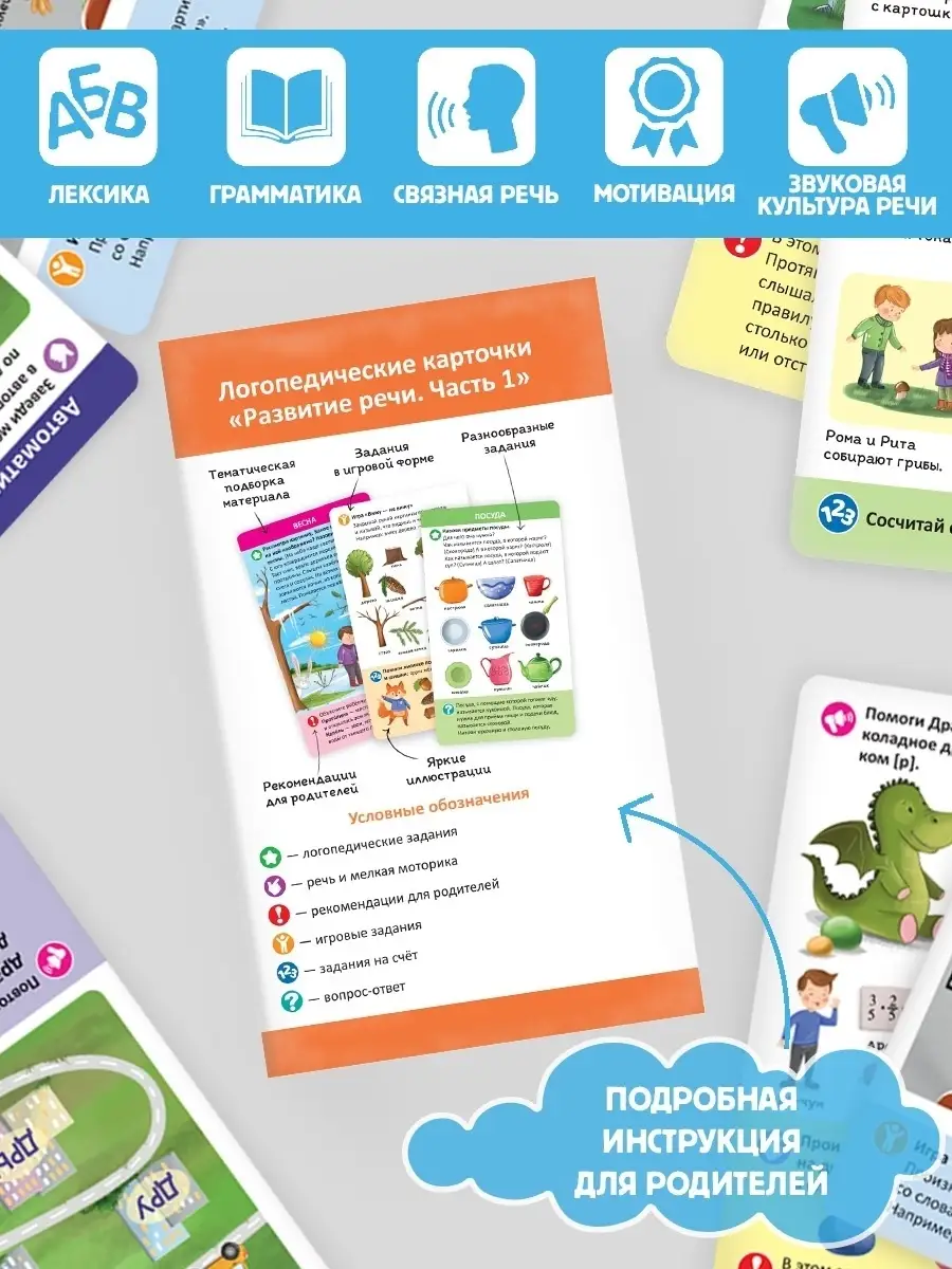 Умные карточки, которые помогут вашему малышу стать настоящим вундеркиндом с пелёнок. Карточки разбиты на наборы по темам, которые направлены на постановку и автоматизацию звуков, предлагают различные упражнения для артикуляционной гимнастики, способствуют запуску речи.