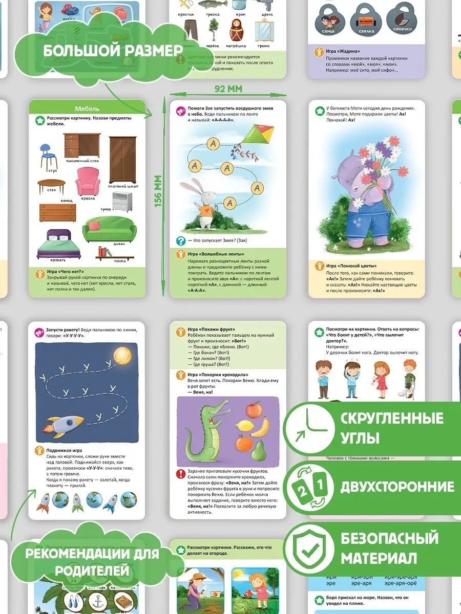 Умные карточки, которые помогут вашему малышу стать настоящим вундеркиндом с пелёнок. Карточки разбиты на наборы по темам, которые направлены на постановку и автоматизацию звуков, предлагают различные упражнения для артикуляционной гимнастики, способствуют запуску речи.