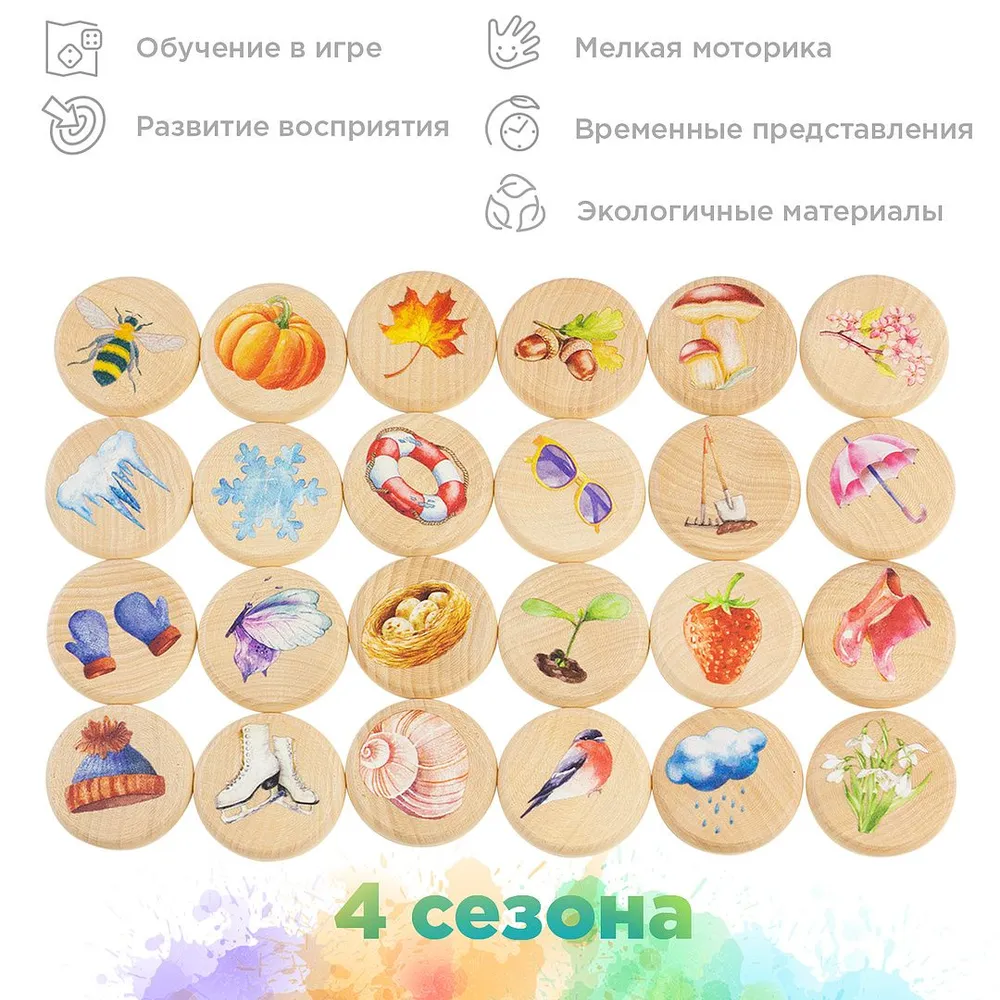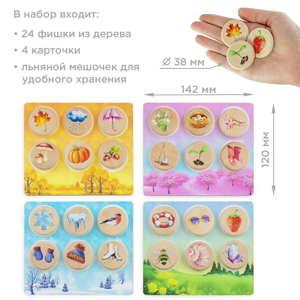 Лото Времена года для самых маленьких игроков. Яркие односторонние карточки с изображением времен года: зима, весна, лето, осень не оставят равнодушным ни одного малыша. Фишки – тактильные и «теплые» на ощупь. Принцип игры – прост. Нужно доставать из мешочка фишки с картинками и искать такую же картинку на своей игровой доске. Выигрывает тот, кто быстрее заполнит свои дощечки фишками.