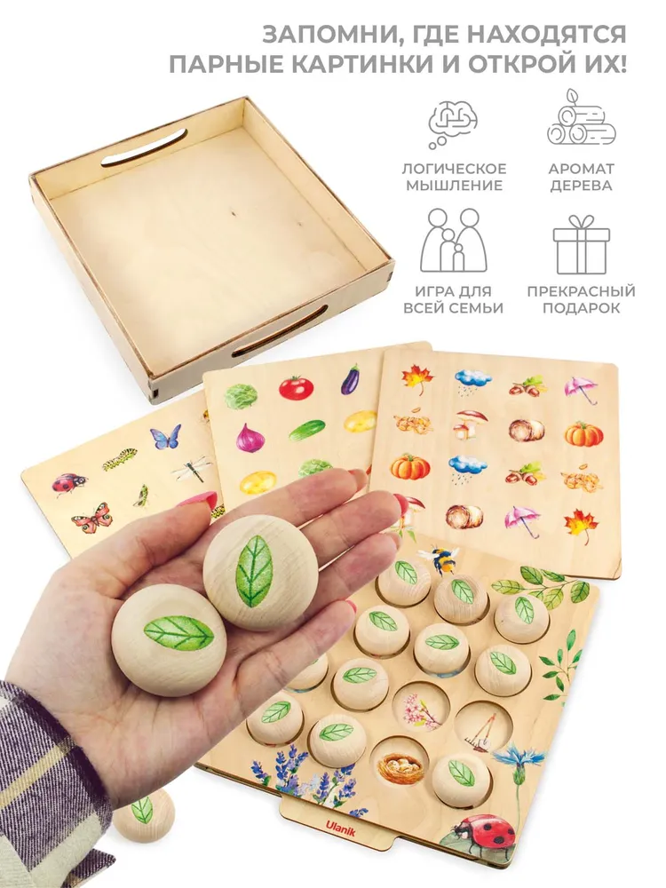 Настольная развивающая игра подойдет для детей от 2 до 7 лет. Помогает развить: внимание, память, моторику, логическое мышление. Построена на методике — найди пару.