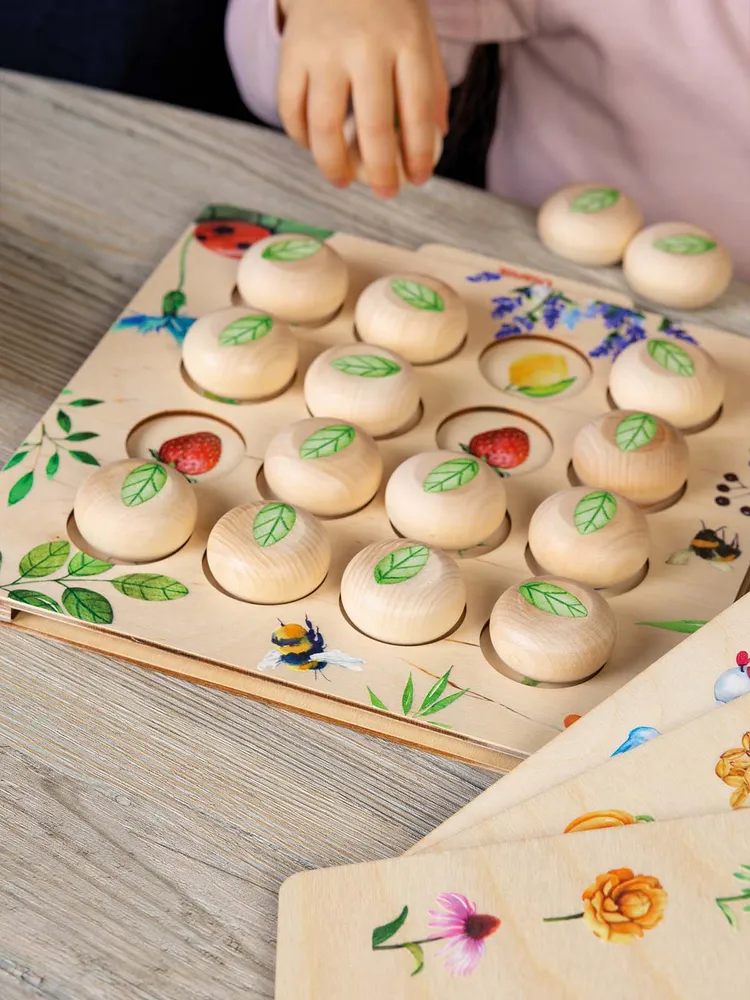 Суть игры: поднимая по 2 фишки с доски найти одинаковые картинки под ними. Если находишь одинаковые картинки — убираешь с них фишки, если не находишь — кладешь обратно. Игра продолжается до тех пор, пока не появятся все картинки, изображенные на дощечке. Играть можно как одному, так и компанией, передавая, после неудачной попытки найди одинаковые картинки, ход следующему игроку. В конечном итоге выиграет тот, кто соберёт больше фишек. Игра является не только развивающей, но и обучающей. Каждая карточка содержит изображения, связанные с природой. Ведь именно в игровой форме ребенок легче и интереснее усваивает информацию.