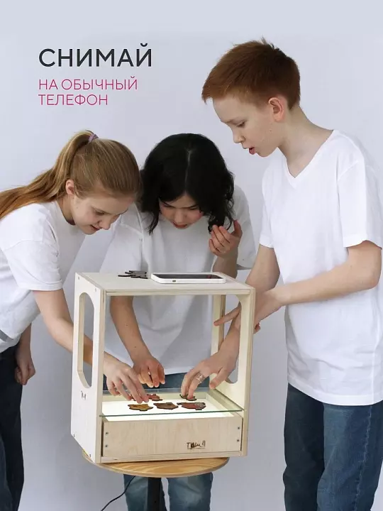 Мультстанок предназначен для съемки методом «перекладки» — техники, в которой используются плоские фигурки из бумаги, перемещаемые по поверхности стола. Кроме того, с его помощью можно создавать короткие ролики в технике песочной анимации, а также снимать изображения в формате А4 и А3.Дети могут сами выбирать сюжет, создавать персонажей и проводить съемку. Все материалы, из которых изготовлена мультстудия, сертифицированы и безопасны для здоровья.