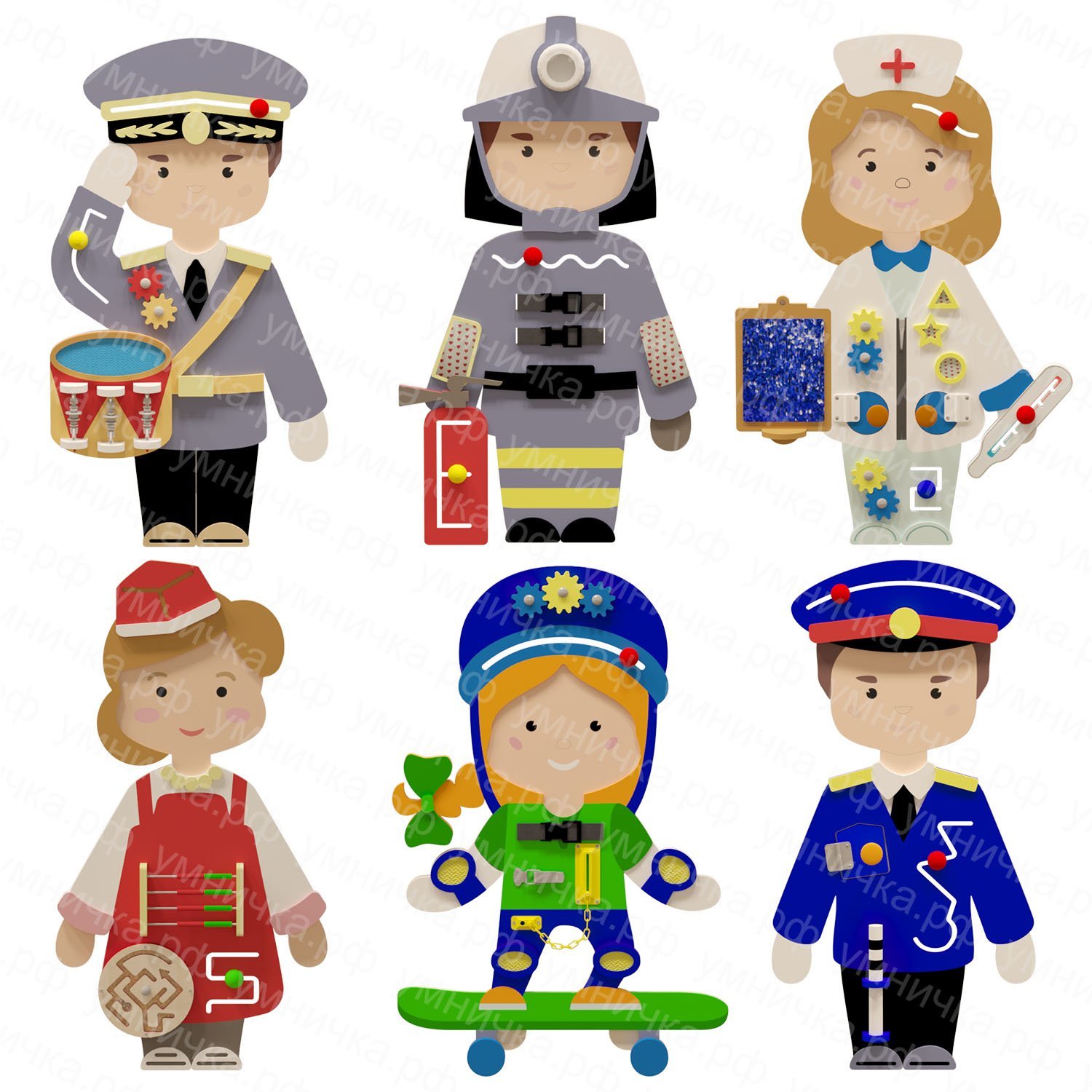 Расскажите дошкольникам о новых и традиционных профессиях с помощью набора бизибордов «Профессии»! В набор входит шесть профессий: часовой, продавец, полицейский, врач, скейтерша и спасатель МЧС.