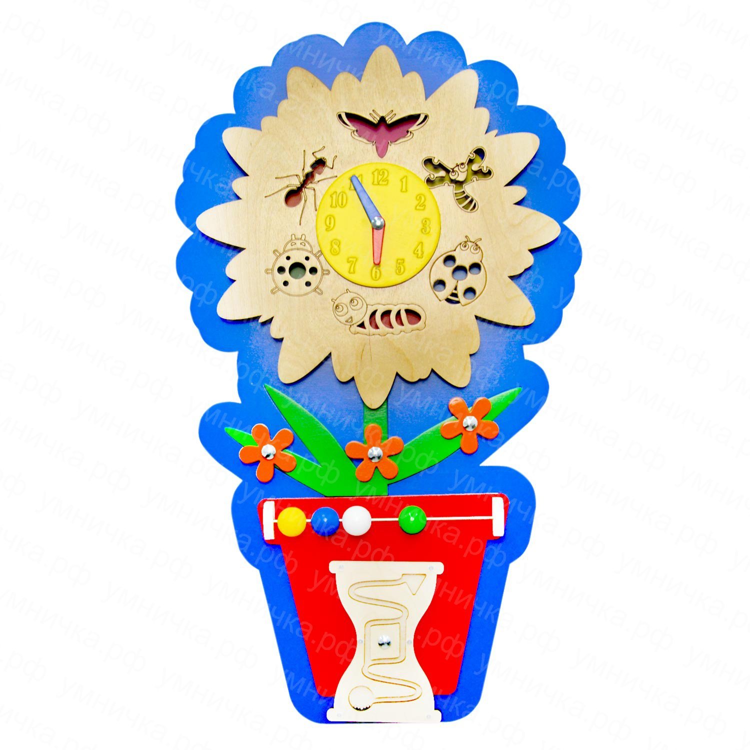 - Ромашка — вместо сердцевинки у ромашки циферблат. На лепестках расположены различные насекомые, а на горшочке настоящие песочные часы. (размер: 75х43 см)