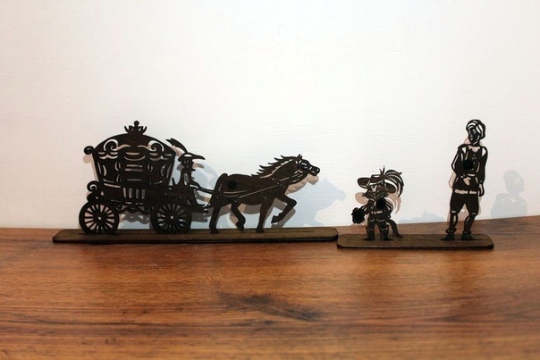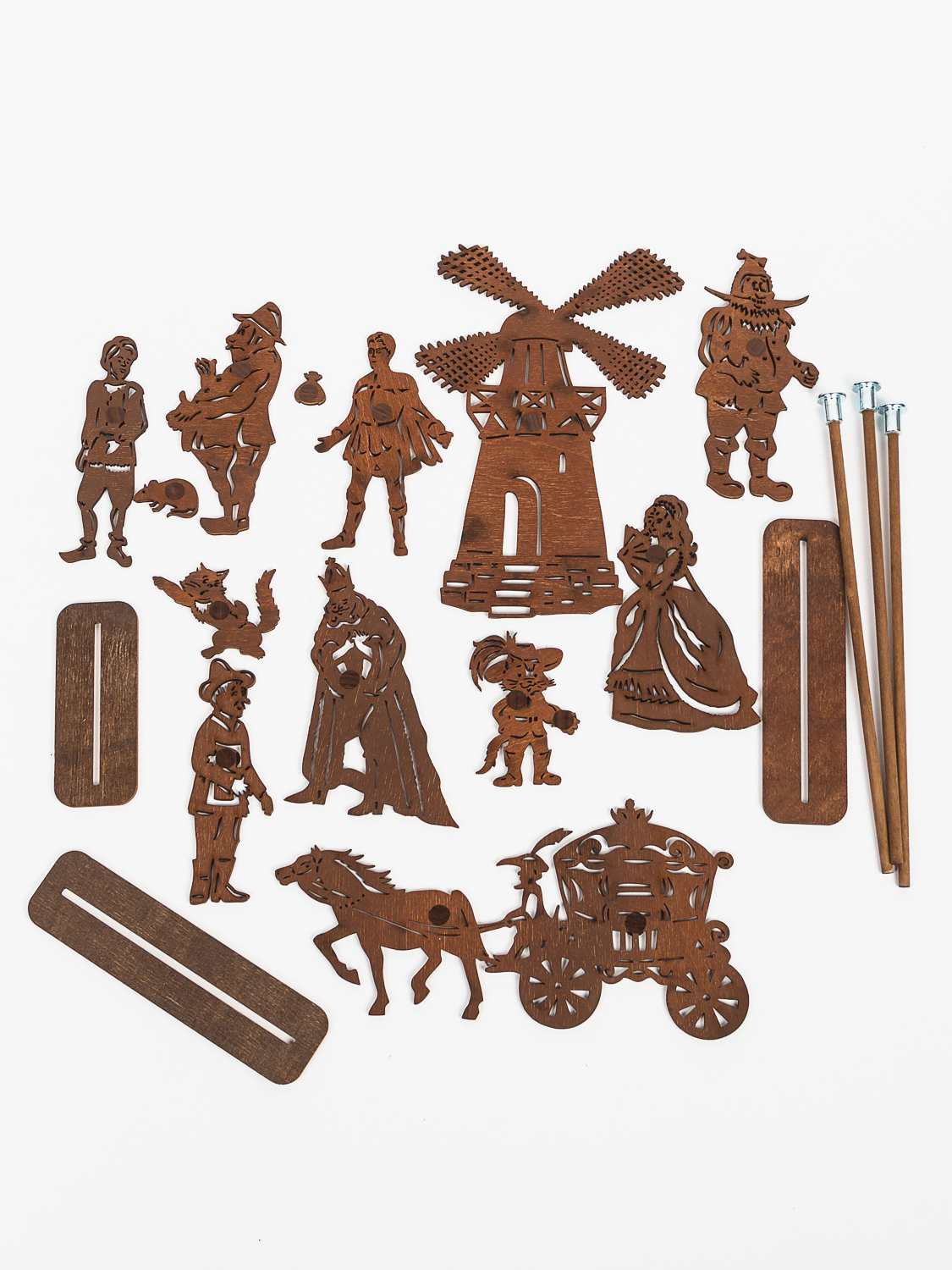 Набор деревянных фигурок из популярной сказки КОТ В САПОГАХ для театра теней "Крошки в окошке" для постановки спектакля в театре теней.