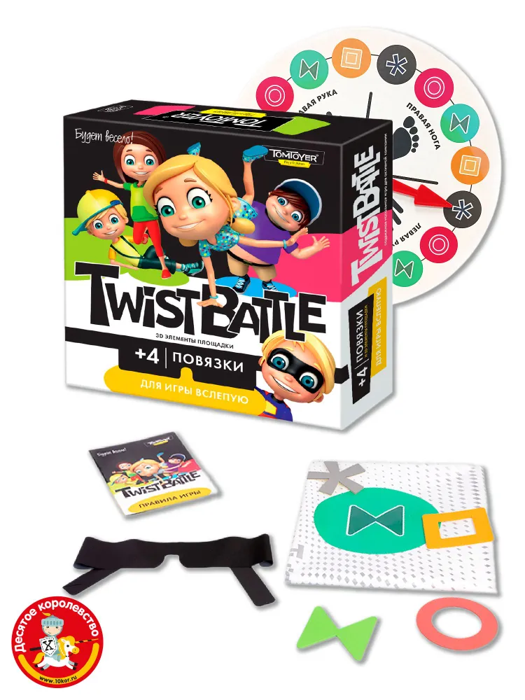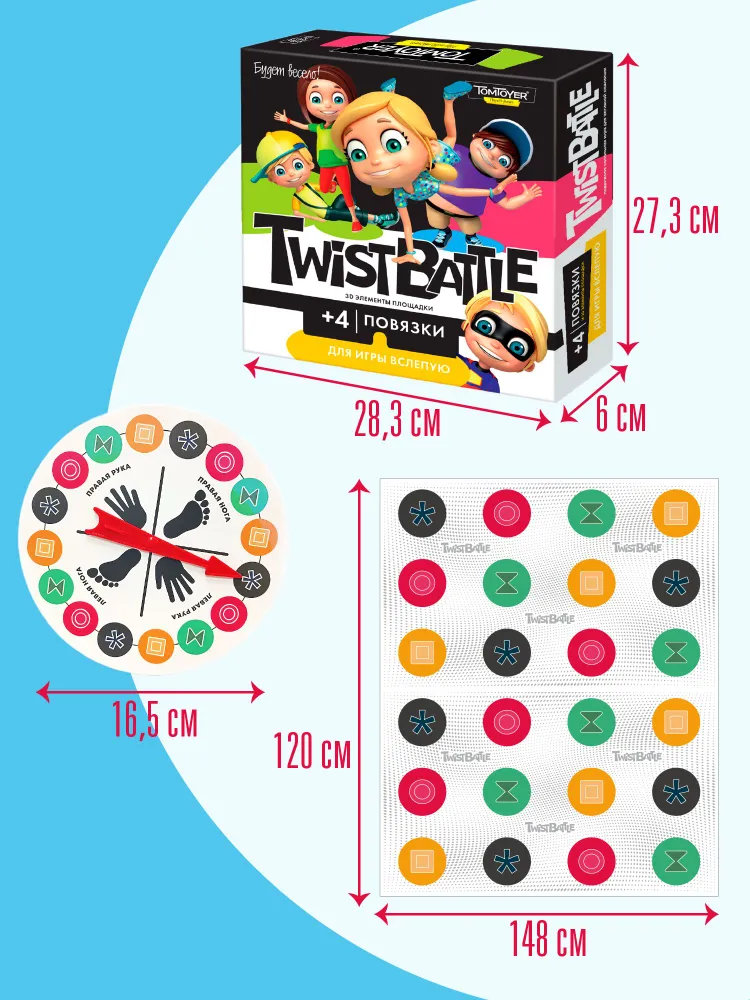 "Twist Battle" с 3D элементами - веселая спортивная игра, которая подойдет как для детей от 3 лет, так и для взрослых. Это развивающая игра получила свой знак "хит продаж" уже достаточно давно и до сих пор удерживает звание одной из лучших. Для начала игры для вечеринки поле надо расстелить на полу, снять обувь и выбрать ведущего, который должен крутить рулетку и называть комбинации игрокам. Победителем же становится тот последний герой, который смог устоять на игровом поле в сложном закрученном положении, не упал и не коснулся коврика коленом или локтем. Игра детская ногами крути входит в блок для вечеринок, а также может подойти для пикника и развлечений на природе. Так как это напольная игра лучше найти площадку поровнее, чтобы было удобнее веселиться. Игровой набор также подойдет для малышей, чтобы занять на время маленьких непосед. Крутой подарок как настольная игра для компании взрослых.