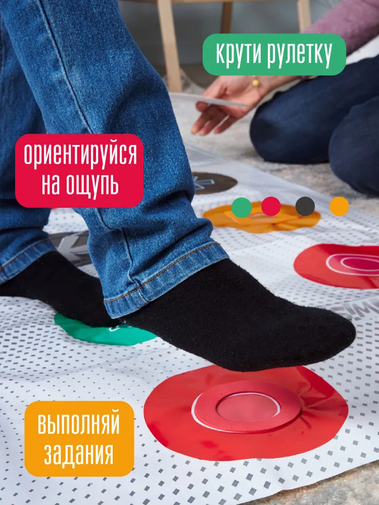 Твистер - веселое подвижное развлечение для семьи и компании. Игровое поле плотное и большое, что позволяет не ограничивать себя в движениях. Удобно хранить. Игра руки ноги развивает гибкость, ловкость, терпение, умение принимать решения и быстро реагировать на изменяющиеся условия, координацию движений, сообразительность.