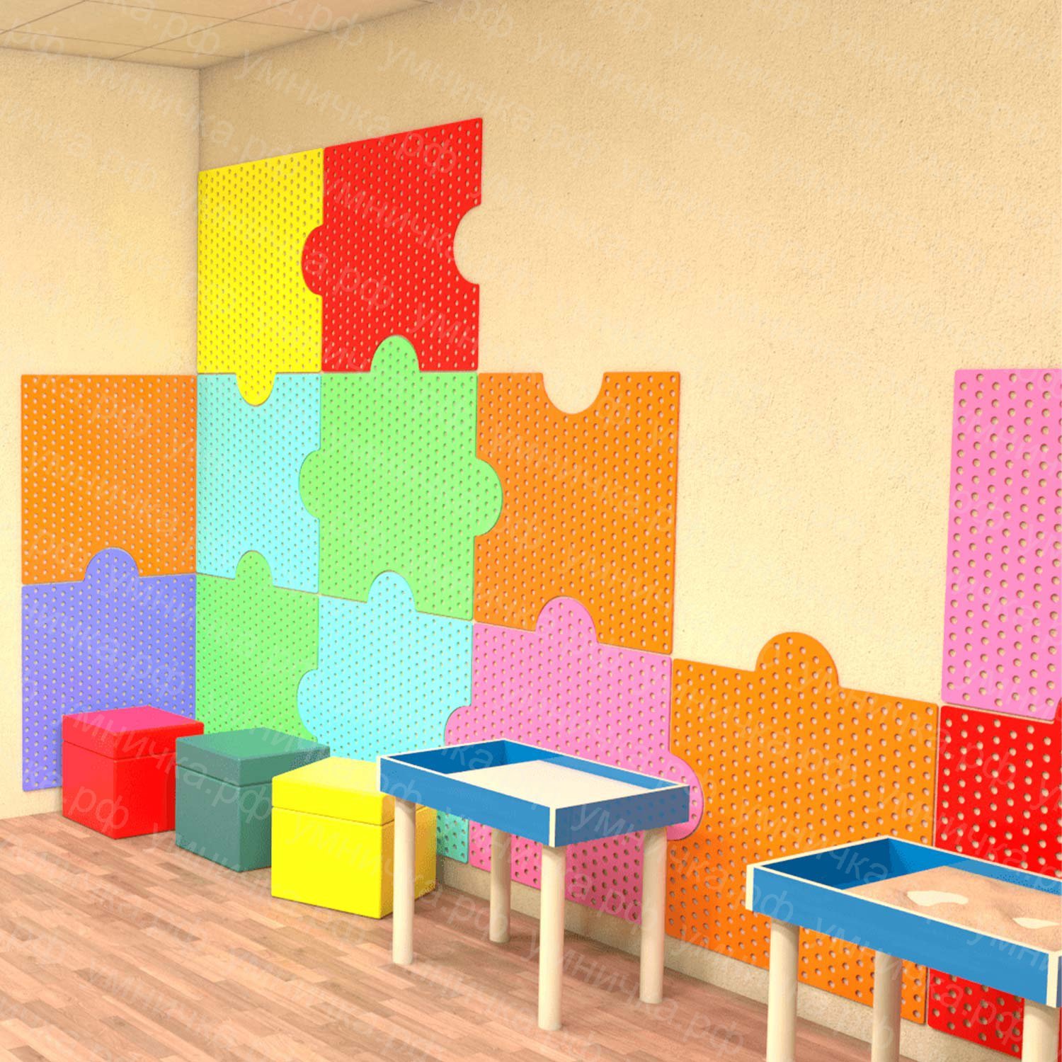 Наши новые настенные многофункциональные панели в виде пазлов помогут сделать Ваш детский сад самым ярким и красочным. Панели надежно крепятся на стену с помощью дюбель гвоздей и на них можно прекрасно зарместить различное игровое оборудование в зоне доступности малышей.