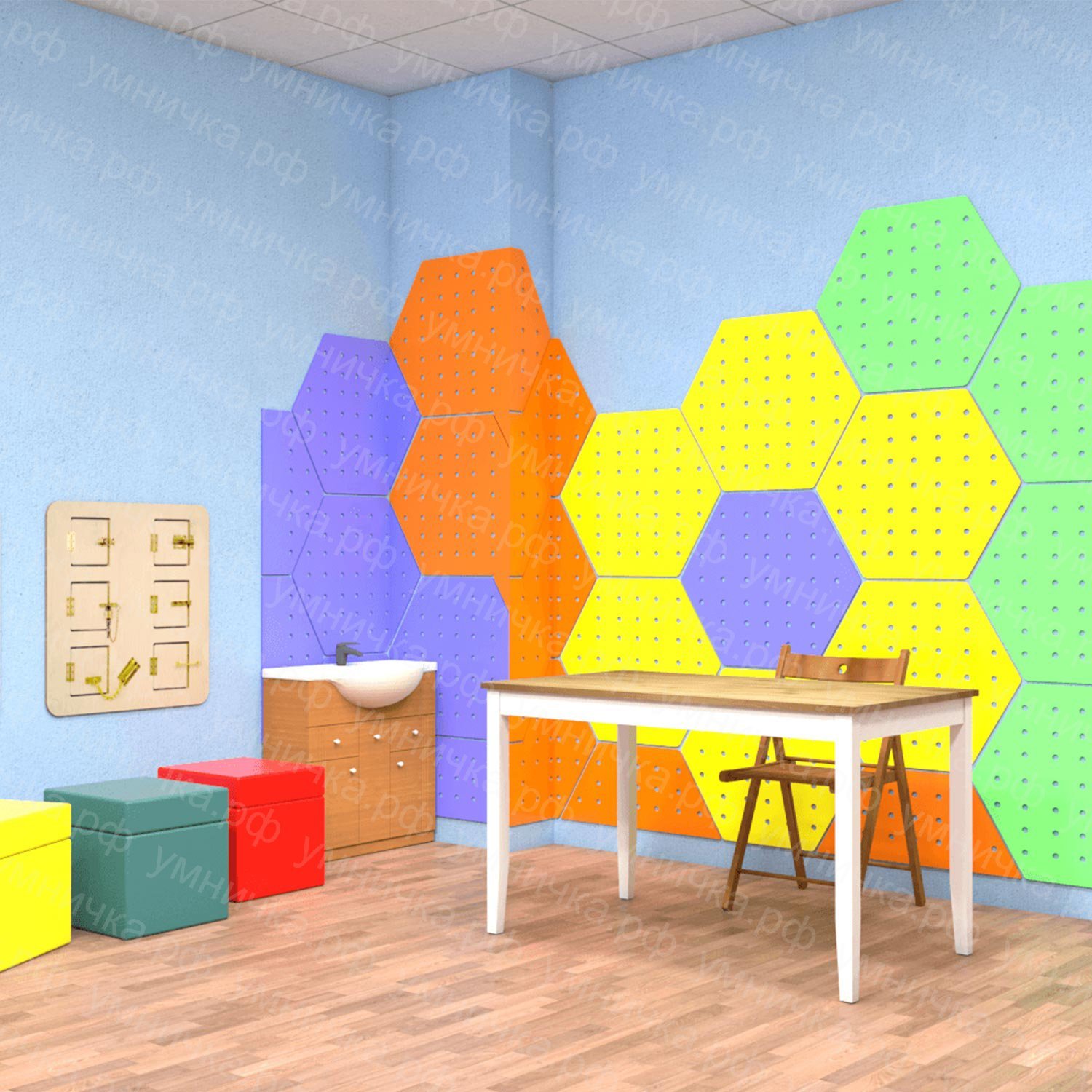 Сборные настенные панели – оптимальное решение для оформления стен ДОО, развивающих центров, сенсорных комнат и кабинетов психолога. Красочные элементы в форме шестиугольников станут не только украшением интерьера, но и местом надёжного крепления развивающего оборудования и полочек.