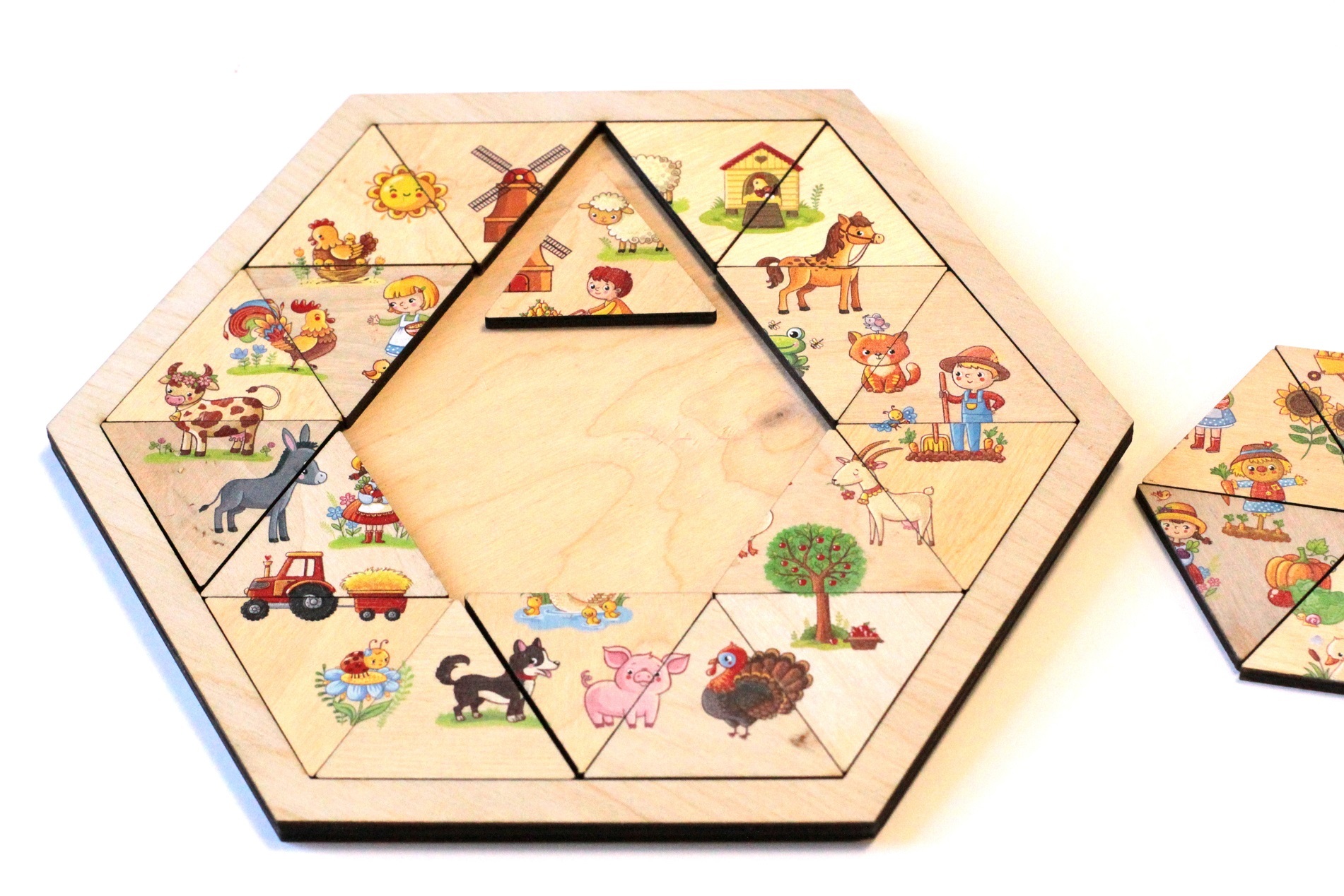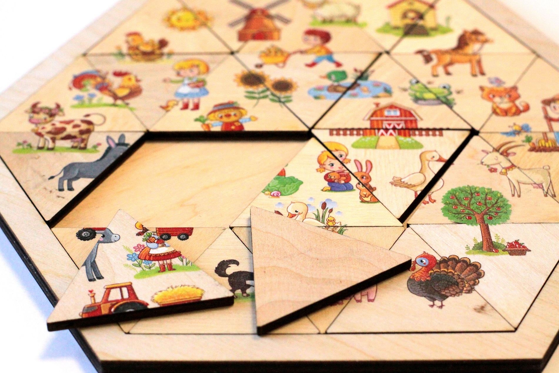Деревянный пазл с треугольными фишками «Ферма» с помощью ярких образов расскажет малышу о фермерской жизни!