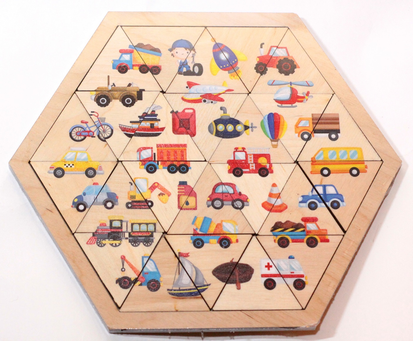 Развивающий деревянный пазл «Транспорт» входит в серию пазлов «Занимательные треугольники» и отличается необычной формой фишек.