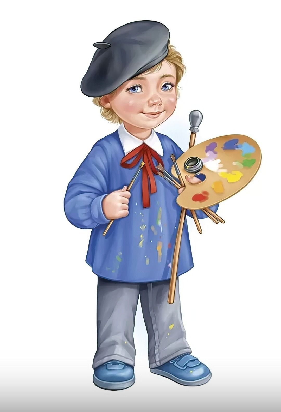 Вырубной двусторонний плакат с изображением мальчика-художника с кистью и палитрой. Подойдет для оформления уголка профессий в школе и детском саду.