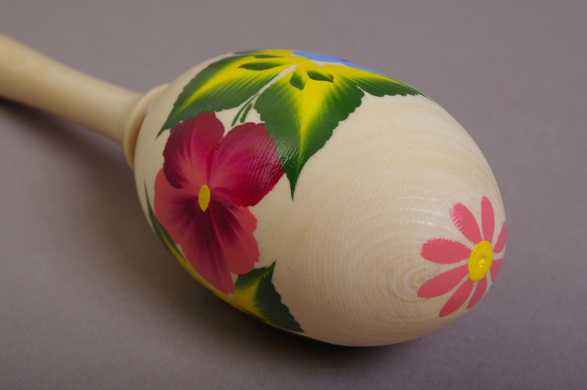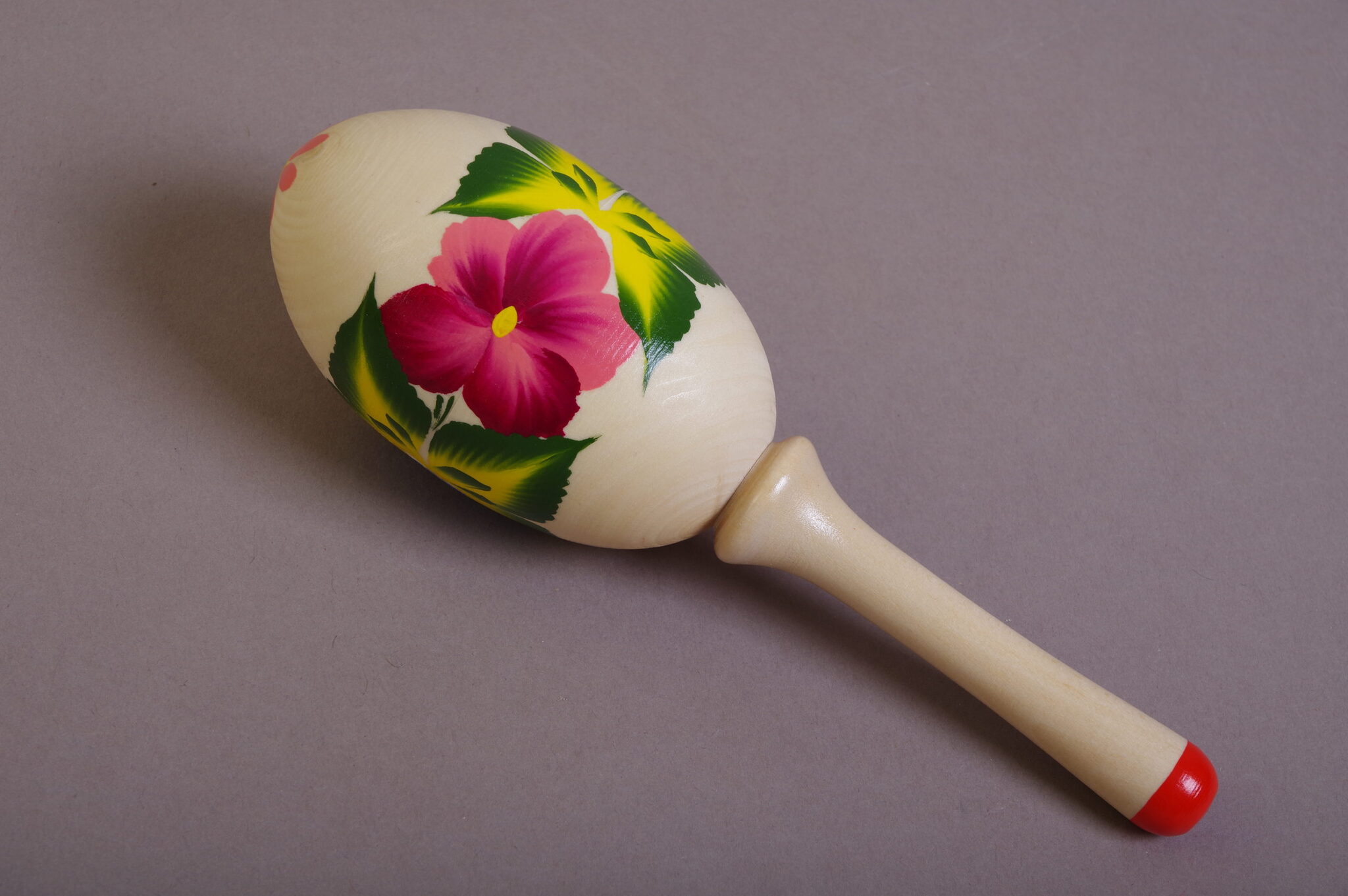 Представляет собой пустотелый деревянный предмет яйцеобразной формы. Внутрь погремушки засыпана охотничья дробь. В нижней части погремушки крепится фигурная ручка токарной работы.