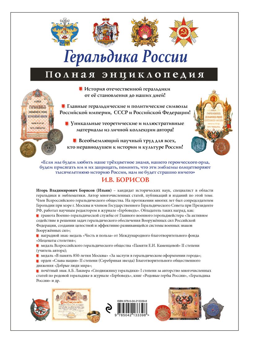 Автор этого уникального труда — кандидат исторических наук, один из ведущих отечественных специалистов в области геральдики и эмблематики И.В. Борисов — на протяжении многих лет состоял в Герольдии при мэре Москвы, а также был членом Государственного Геральдического Совета при Президенте России.