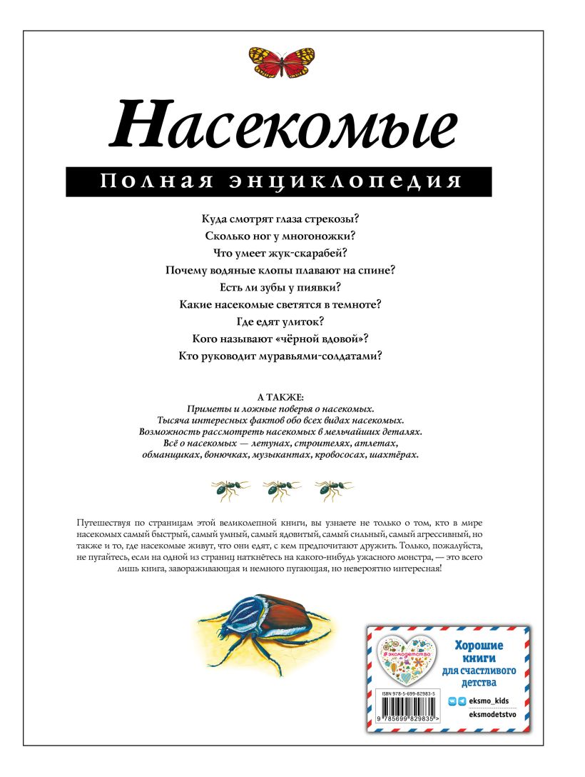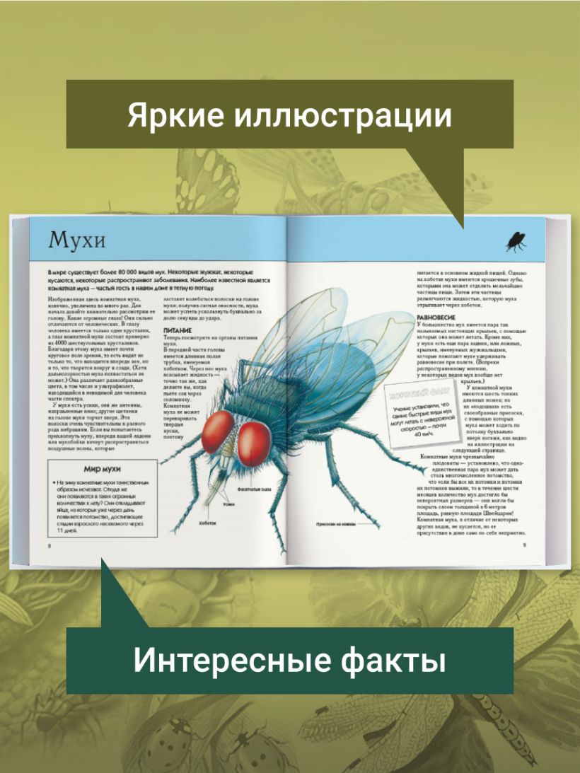 Эта энциклопедия расскажет, кто из насекомых самый быстрый, умный, ядовитый и сильный, где они живут, что едят, с кем враждуют, а с кем сосуществуют мирно. Только, пожалуйста, не пугайтесь, если на одной из страниц наткнетесь на какого-нибудь ужасного членистоногого монстра: насекомые — завораживающие и немного пугающие, но невероятно интересные существа!