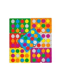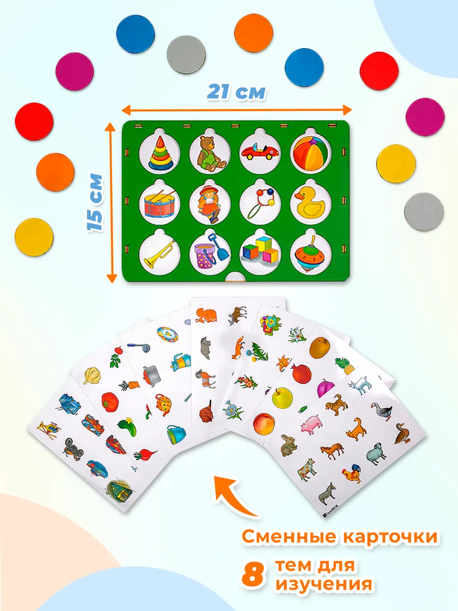 4 двухсторонние карточки, 12 деревянных кружков-окошек
